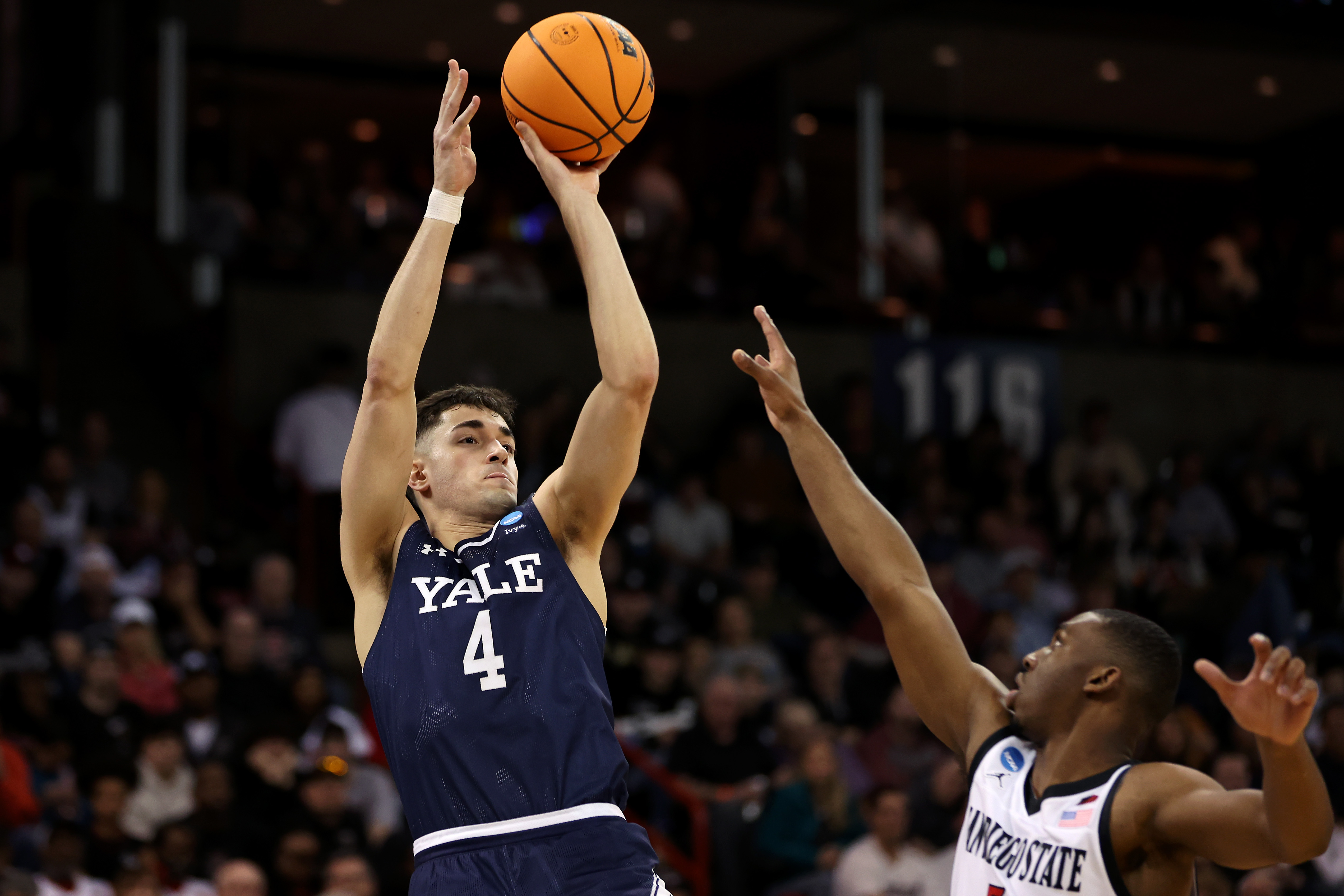 Getty SPOKANE, WASHINGTON – 24 DE MARZO: John Poulakidas #4 de los Yale Bulldogs lanza el balón contra Lamont Butler #5 de los San Diego State Aztecs durante la primera mitad de la segunda ronda del Torneo de Baloncesto Masculino de la NCAA en el Spokane Veterans Memorial Arena el 24 de marzo de 2024 en Spokane, Washington. (Foto de Steph Chambers/Getty Images)