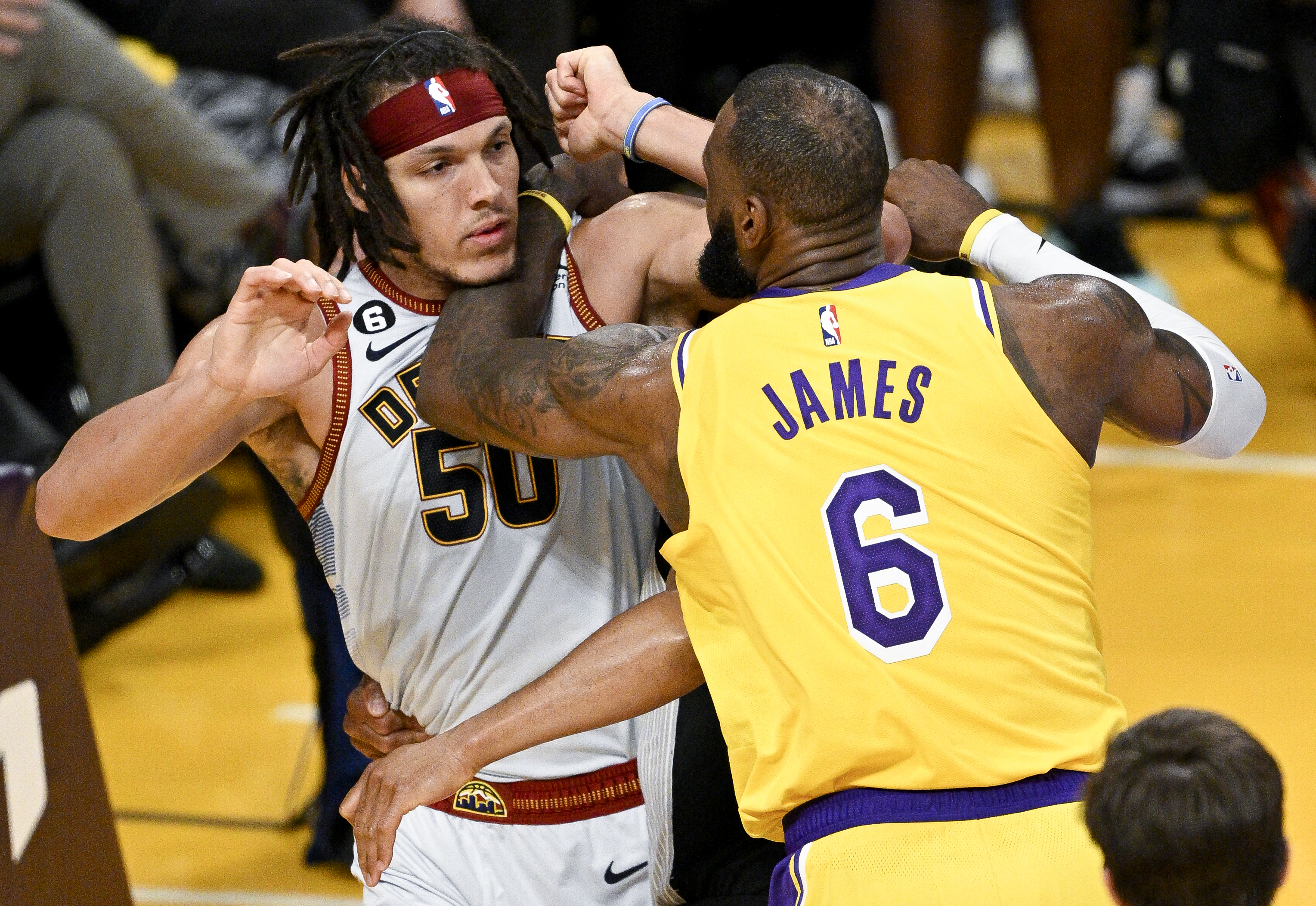 Getty LOS ÁNGELES, CA – 22 DE MAYO: El alero de Los Angeles Lakers, LeBron James, derecha, y el alero de Denver Nuggets, Aaron Gordon, se enzarzan en una pelea durante el segundo cuarto del cuarto juego en las NBA Finales de la Conferencia Oeste de los Playoffs en Crypto.com Arena el lunes 22 de mayo de 2023 en Los Ángeles, CA. (Gina Ferazzi / Los Angeles Times vía Getty Images)