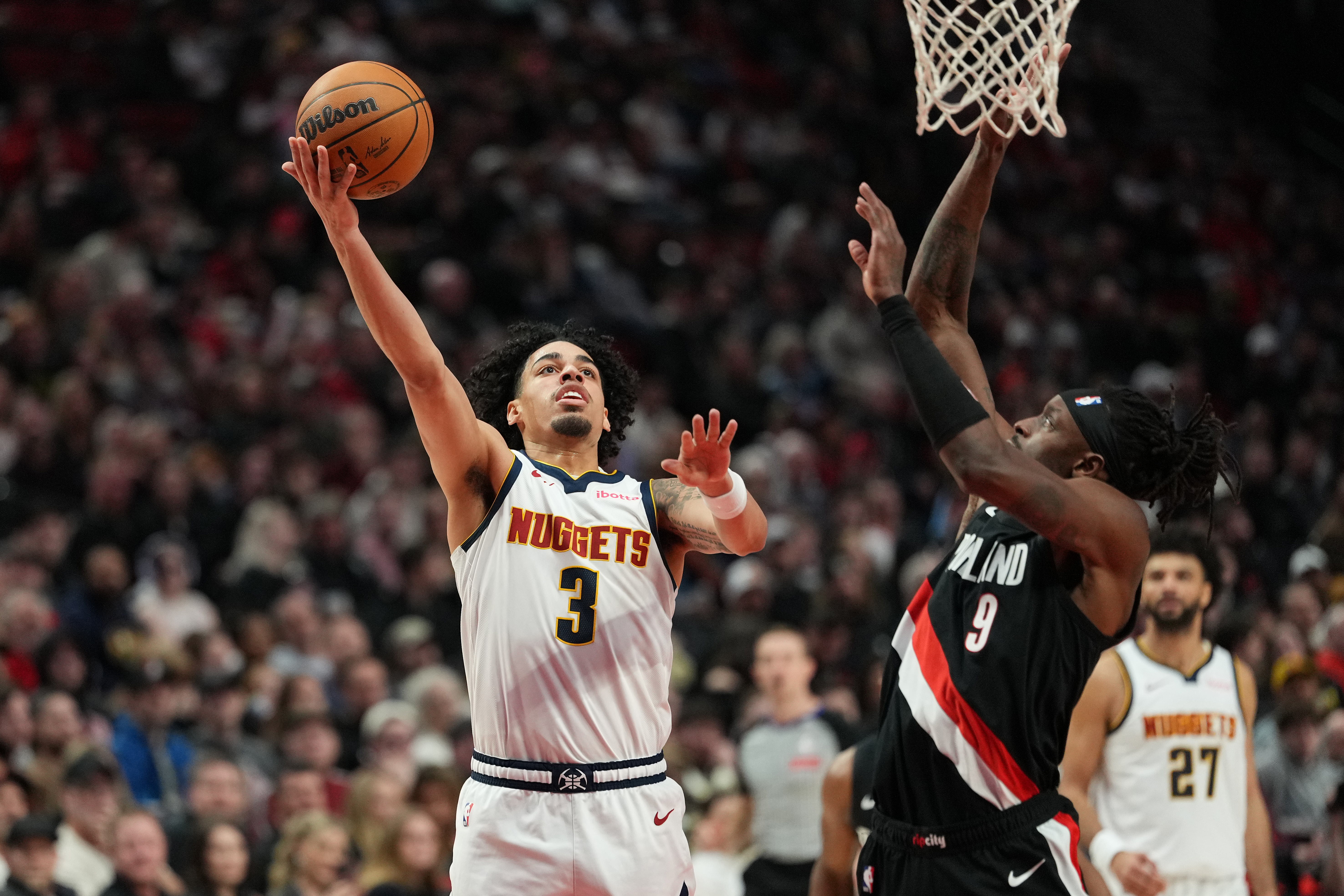 Getty PORTLAND, OREGÓN – 20 DE FEBRERO: Julian Strawther #3 de los Denver Nuggets encesta un tiro defendido por Jerami Grant #9 de los Portland Trail Blazers durante la segunda mitad en el Moda Center el 20 de febrero de 2026 en Portland, Oregón. (Foto de Soobum Im/Getty Images)