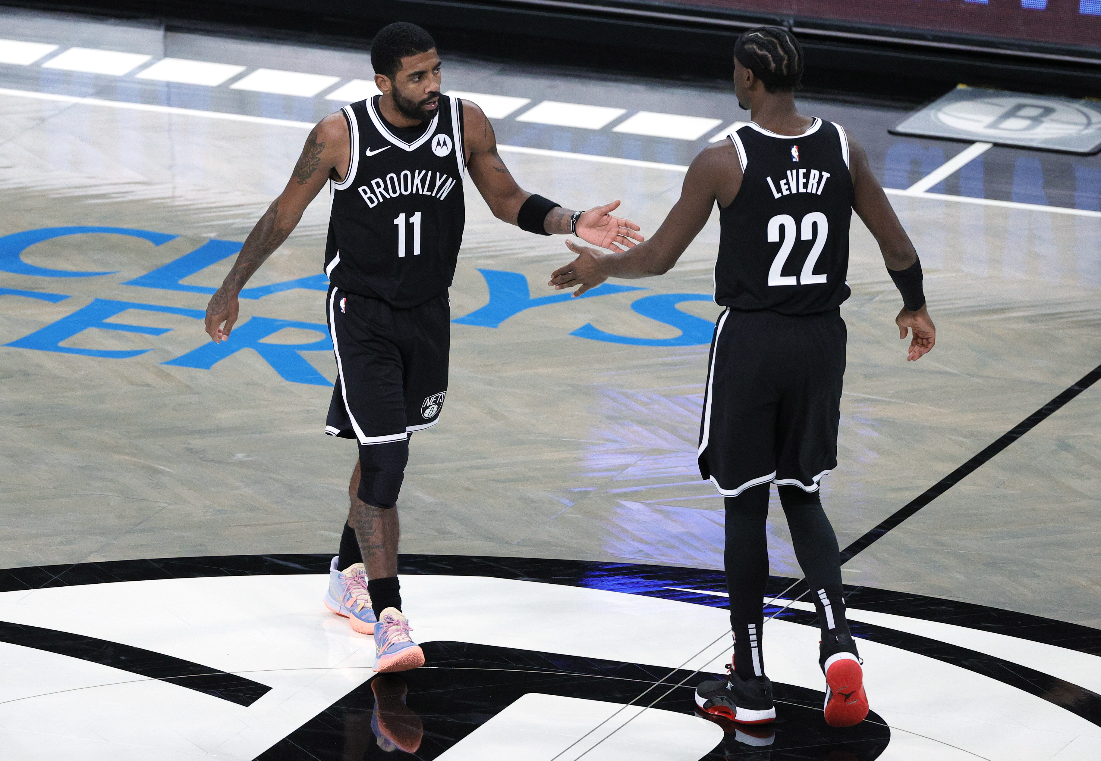 GettyNUEVA YORK, NUEVA YORK – 22 DE DICIEMBRE: Kyrie Irving #11 choca los cinco con Caris LeVert #22 de los Brooklyn Nets durante la primera mitad contra los Golden State Warriors en el Barclays Center el 22 de diciembre de 2020 en el distrito de Brooklyn de la ciudad de Nueva York. (Foto de Sarah Stier/Getty Images)