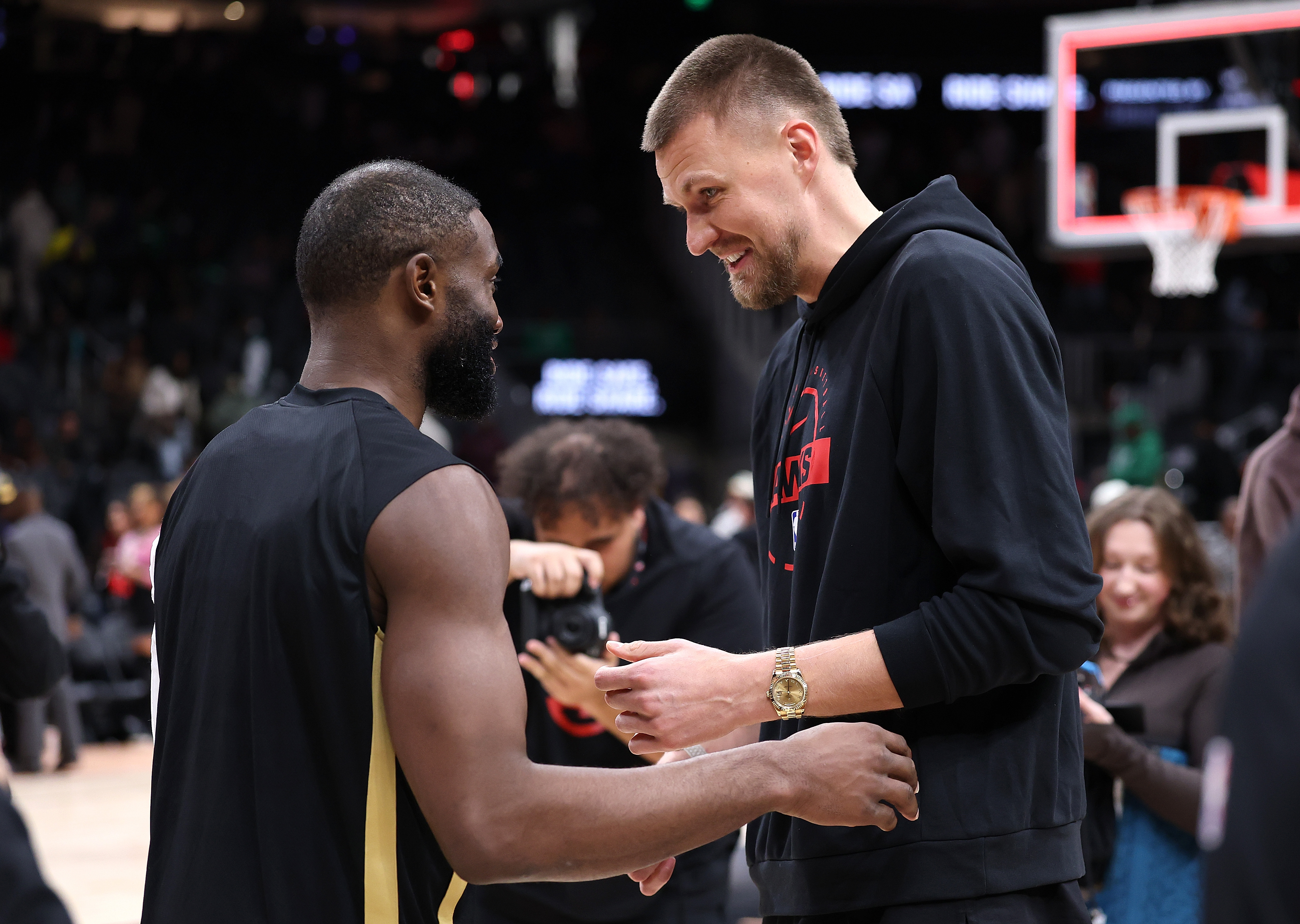 Getty ATLANTA, GEORGIA – 17 DE ENERO: Kristaps Porzingis, número 8 de los Atlanta Hawks conversa con Jaylen Brown número 7 de los Boston Celtics tras su derrota por 132-106 en el State Farm Arena el 17 de enero de 2026 en Atlanta, Georgia. N(Foto de Kevin C. Cox/Getty Images)
