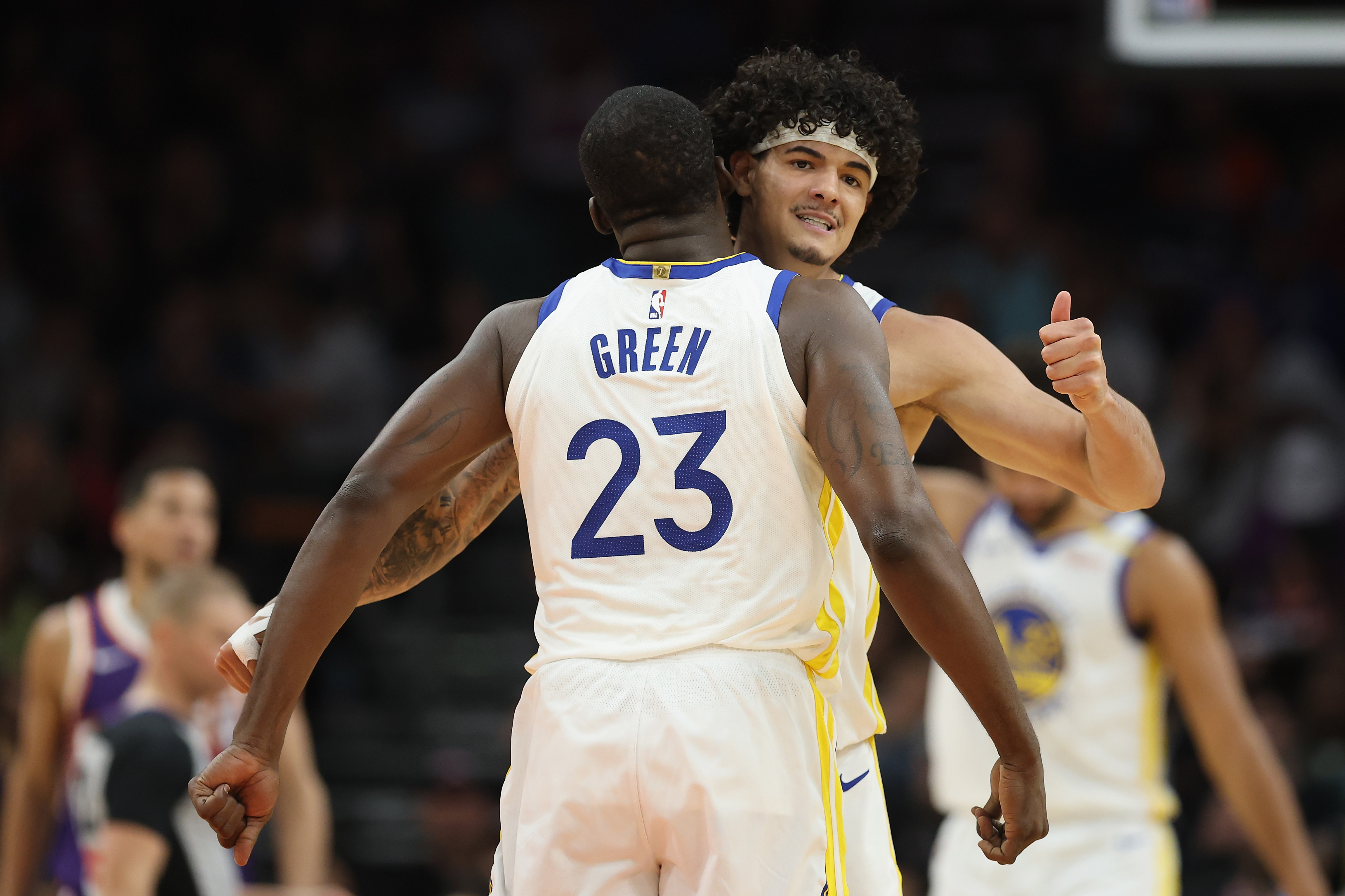 Getty PHOENIX, ARIZONA – 8 DE ABRIL: Gui Santos #15 de los Golden State Warriors celebra con Draymond Green #23 durante la primera mitad del partido de la NBA { contra los Phoenix Suns en el PHX Arena el 8 de abril de 2025 en Phoenix, Arizona. (Foto de Christian Petersen/Getty Images)