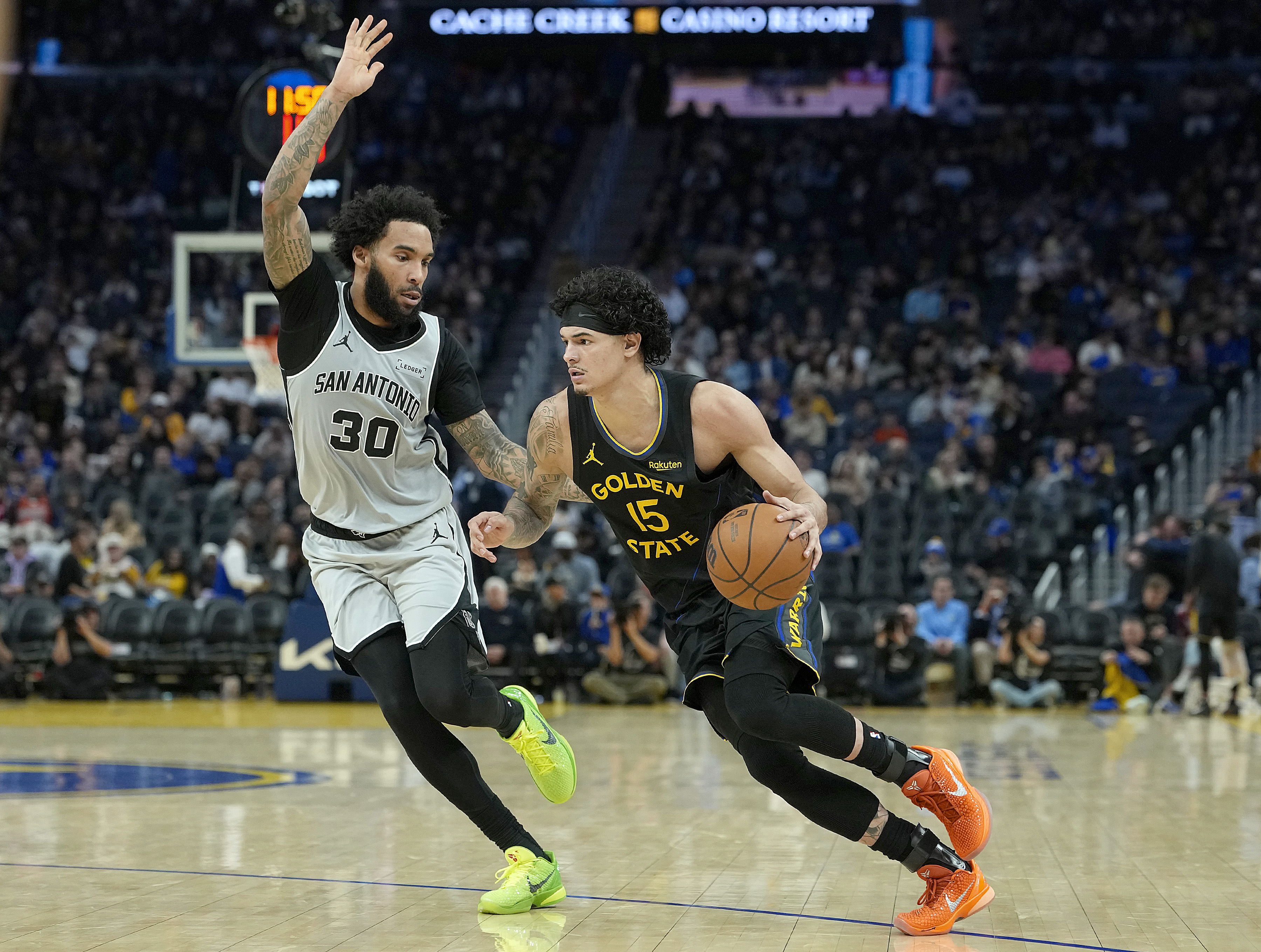 Getty SAN FRANCISCO, CALIFORNIA – 11 DE FEBRERO: Gui Santos #15 de los Golden State Warriors conduce hacia la canasta sobre Julian Champagnie #30 de los San Antonio Spurs en la segunda mitad en el Chase Center el 11 de febrero de 2026 en San Francisco, California. (Foto de Thearon W. Henderson/Getty Images)