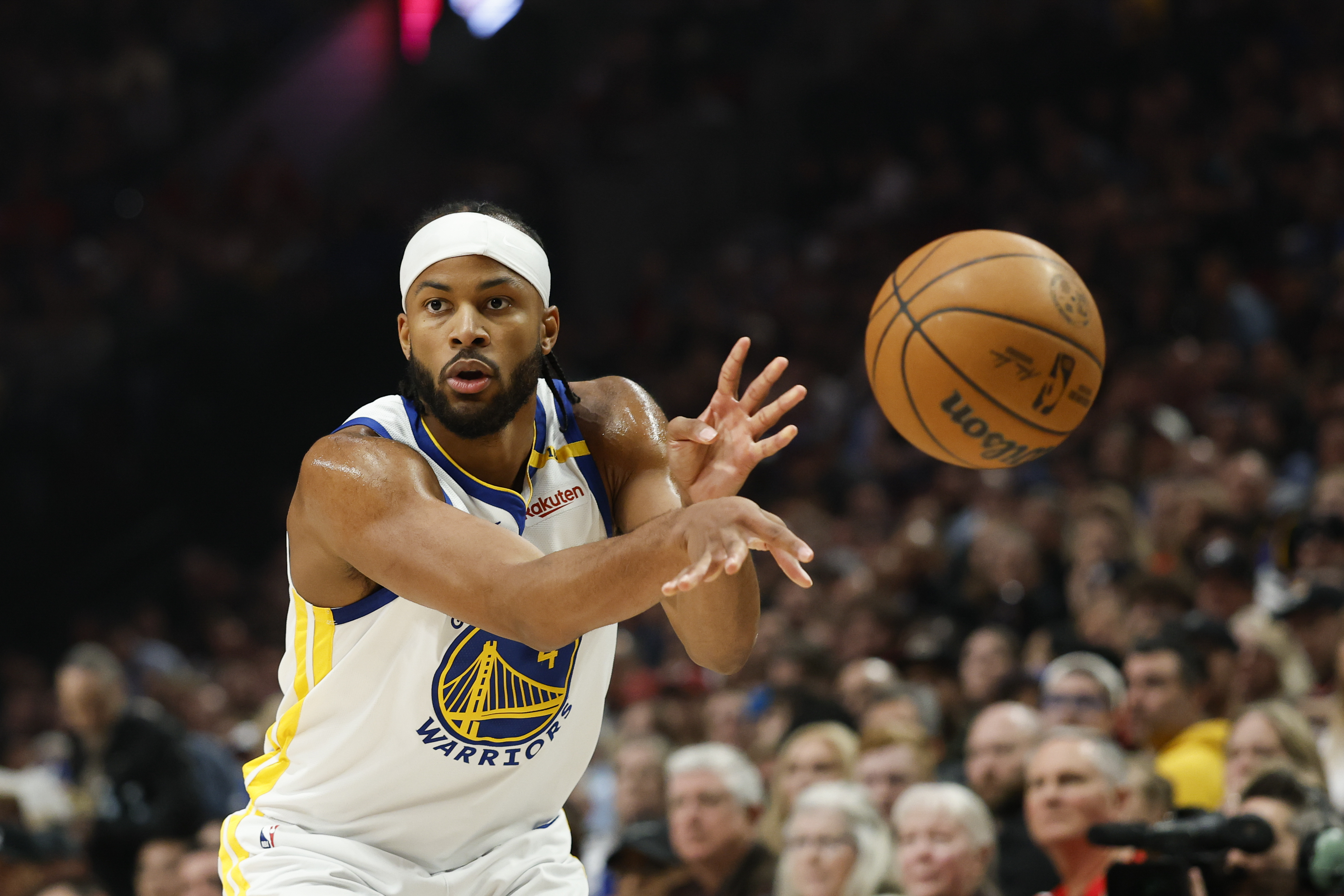 Getty PORTLAND, OREGÓN – 11 DE ABRIL: Moses Moody #4 de los Golden State Warriors pasa el balón durante el primer cuarto del partido contra los Portland Trail Blazers en el Moda Center el 11 de abril de 2025 en Portland, Oregón. (Foto de Alika Jenner/Getty Images)