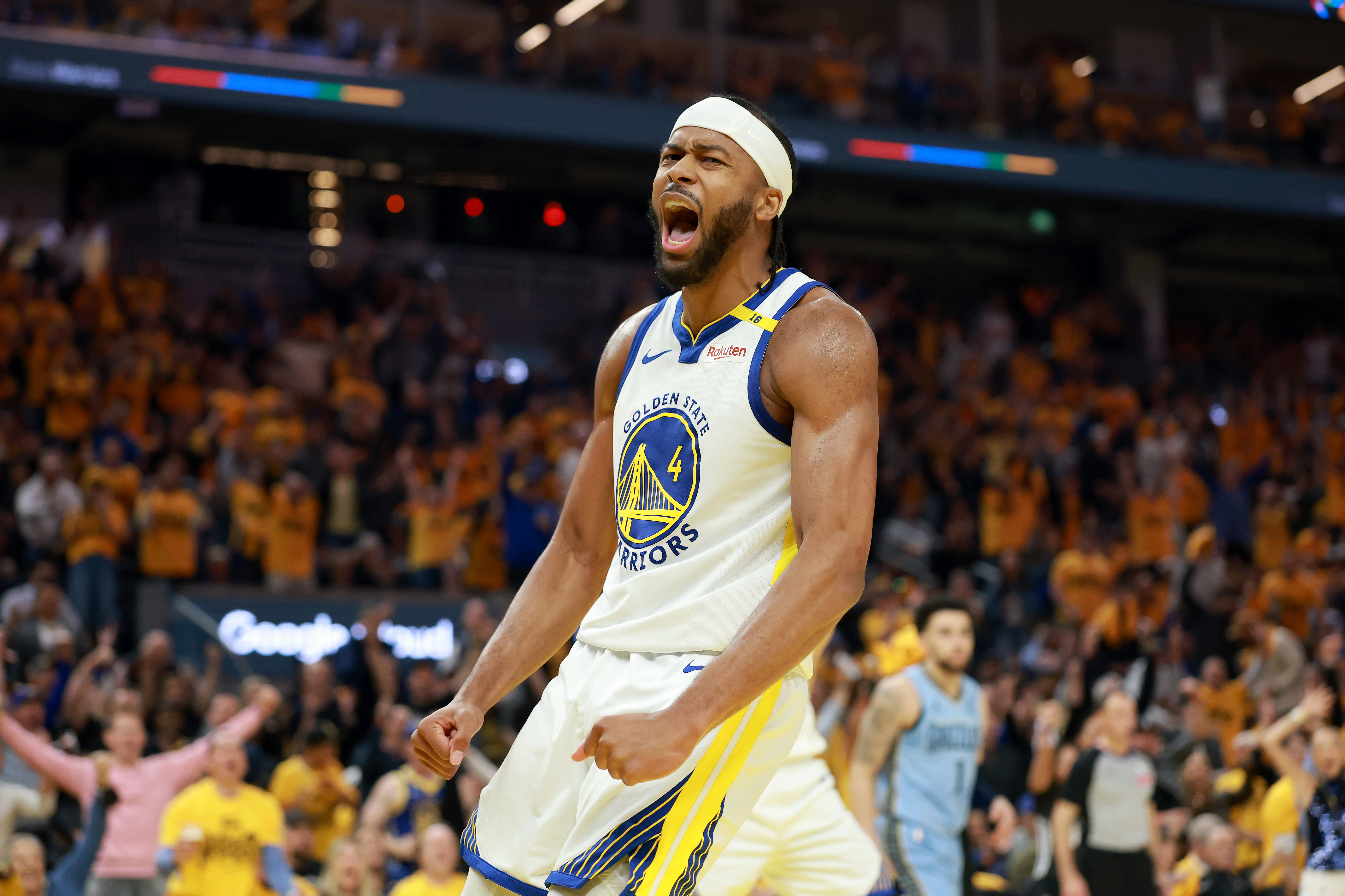 Getty SAN FRANCISCO, CALIFORNIA – 15 DE ABRIL: Moses Moody #4 de los Golden State Warriors reacciona después de hacer un mate contra los Memphis Grizzlies en la primera mitad del partido del torneo de play-in de la NBA en el Chase Center el 15 de abril de 2025 en San Francisco, California. (Foto de Ezra Shaw/Getty Images)