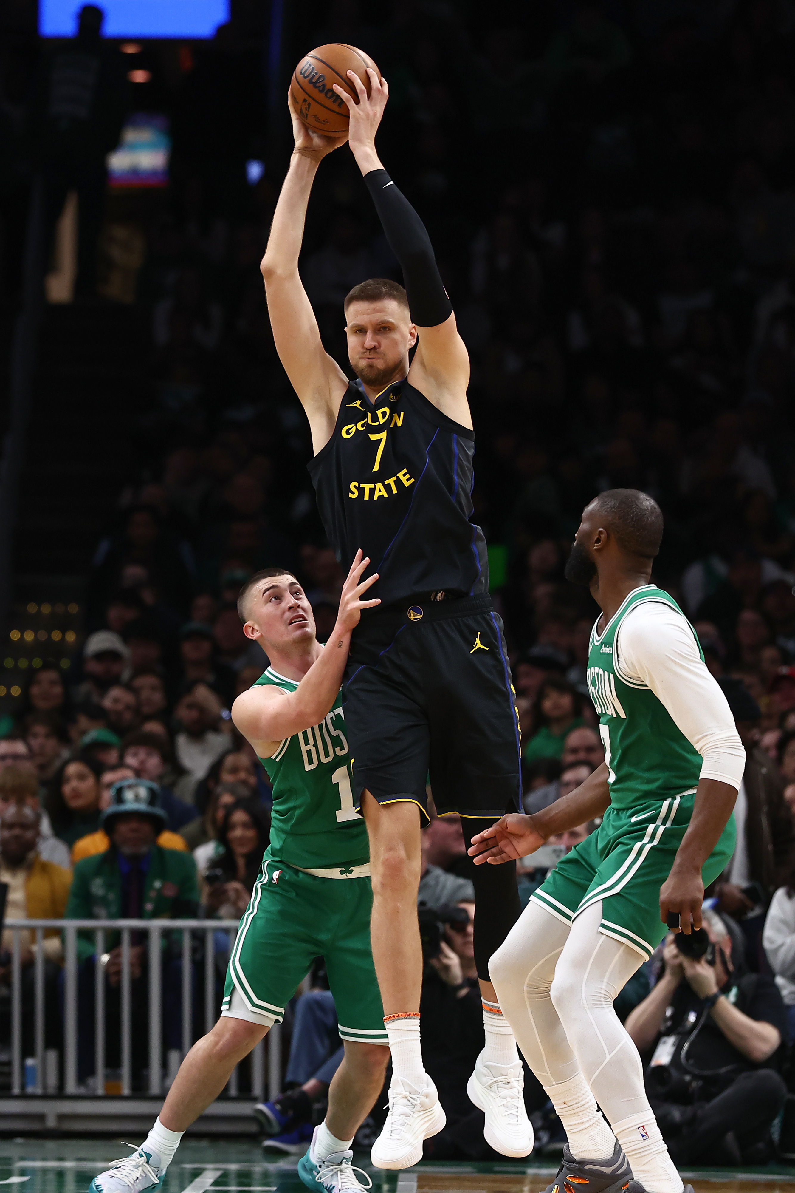 GettyBOSTON, MA – 18 DE MARZO: Kristaps Porzingis #7 de los Golden State Warriors atrapa un pase entre Payton Pritchard #11 de los Boston Celtics y Jaylen Brown #7 durante la segunda mitad en el TD Garden el 18 de marzo de 2026 en Boston, Massachusetts. (Foto de Winslow Townson/Getty Images)