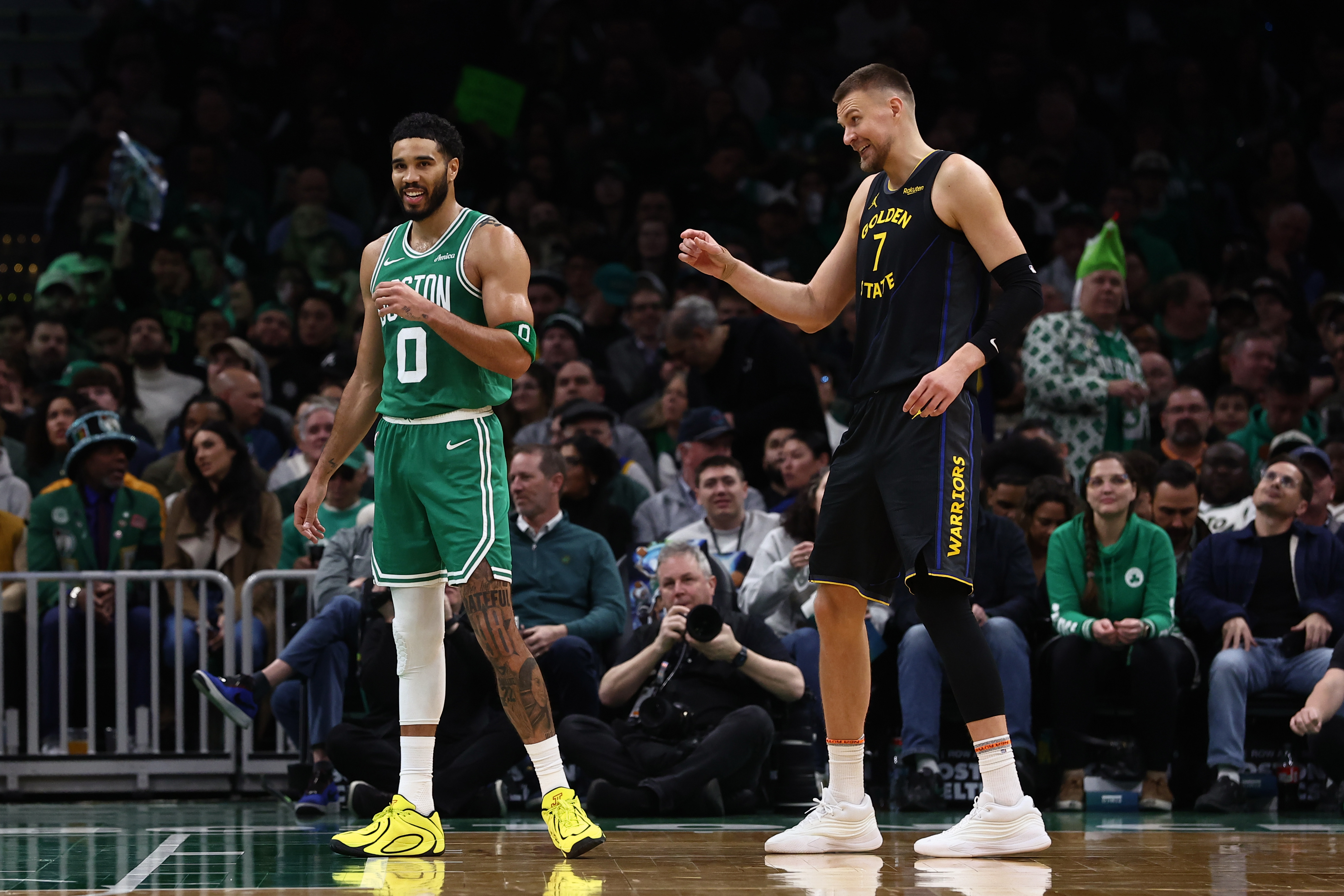 Getty BOSTON, MA – 18 DE MARZO: Kristaps Porzingis #7 de los Golden State Warriors comparte una risa con su excompañero Jayson Tatum #0 de los Boston Celtics durante la segunda mitad en el TD Garden el 18 de marzo de 2026 en Boston, Massachusetts. (Foto de Winslow Townson/Getty Images)