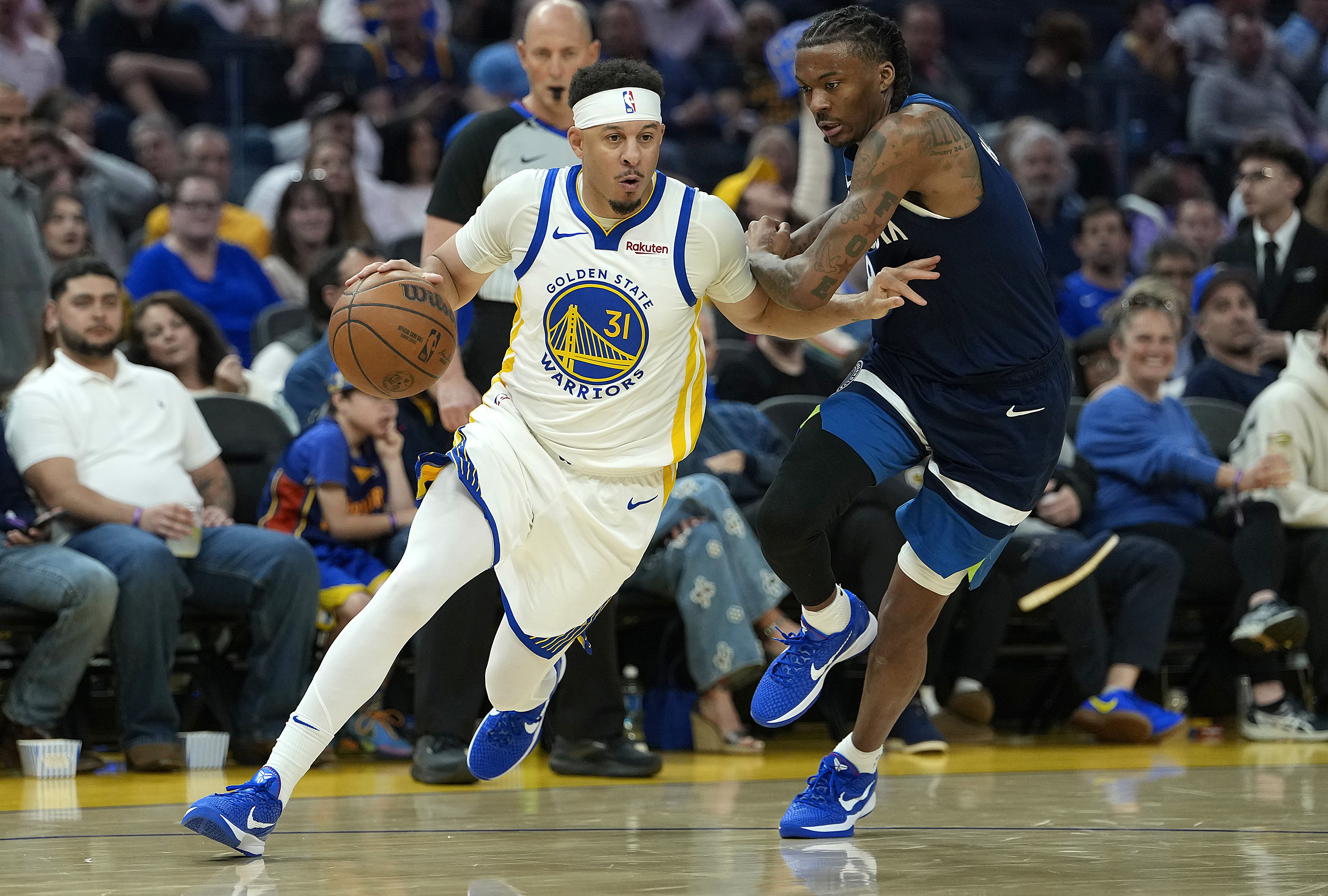 Getty Seth Curry #31 de los Golden State Warriors penetra hacia la canasta pasando Bones Hyland #8 de los Minnesota Timberwolves en la primera mitad en el Chase Center el 13 de marzo de 2026 en San Francisco, California.