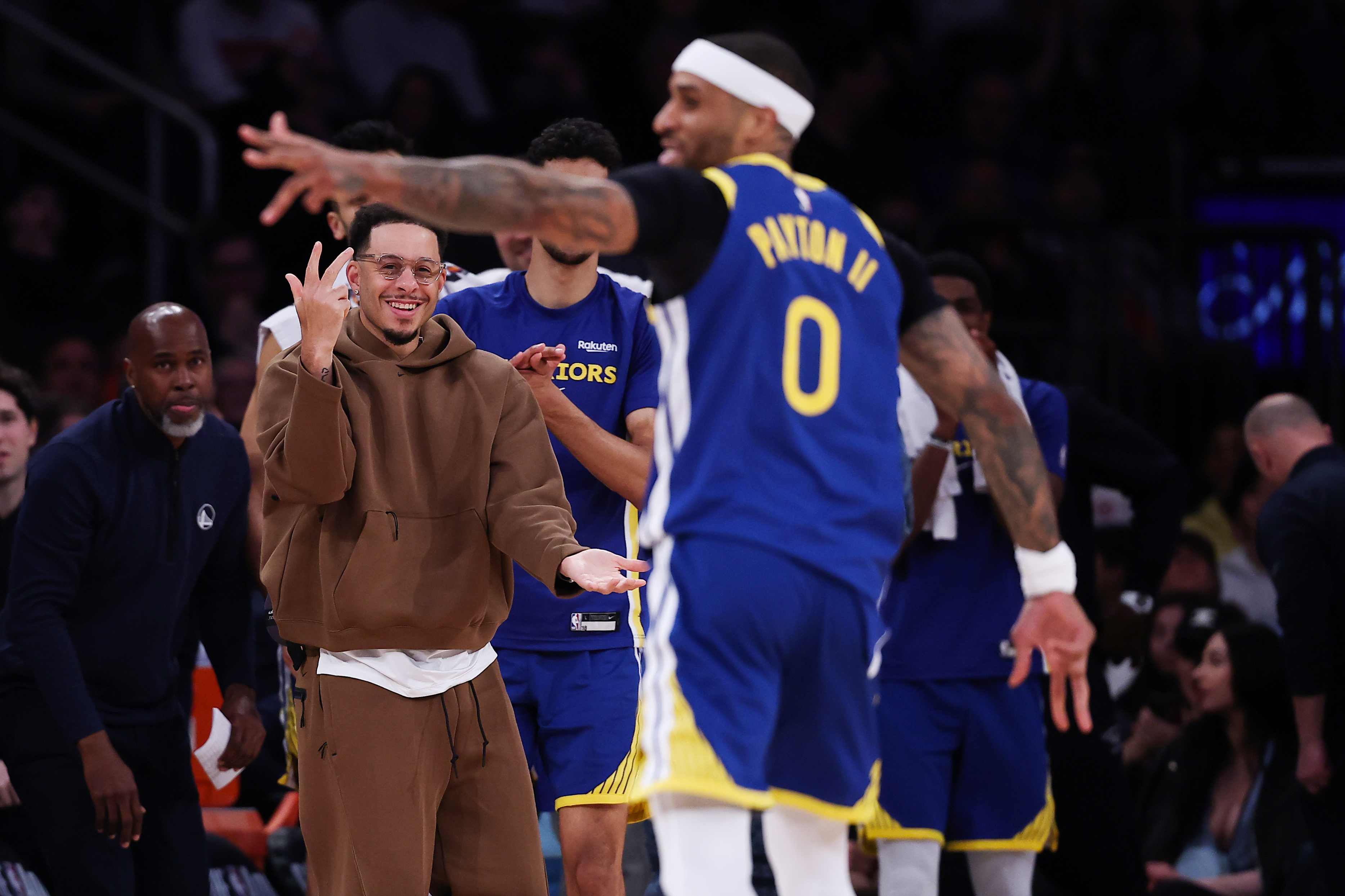 Getty Seth Curry #31 de los Golden State Warriors reacciona en la banda después de que Gary Payton II #0 de los Golden State Warriors haga un triple durante el segundo cuarto del partido contra los New York Knicks en el Madison Square Garden el 15 de marzo de 2026 en la ciudad de Nueva York.