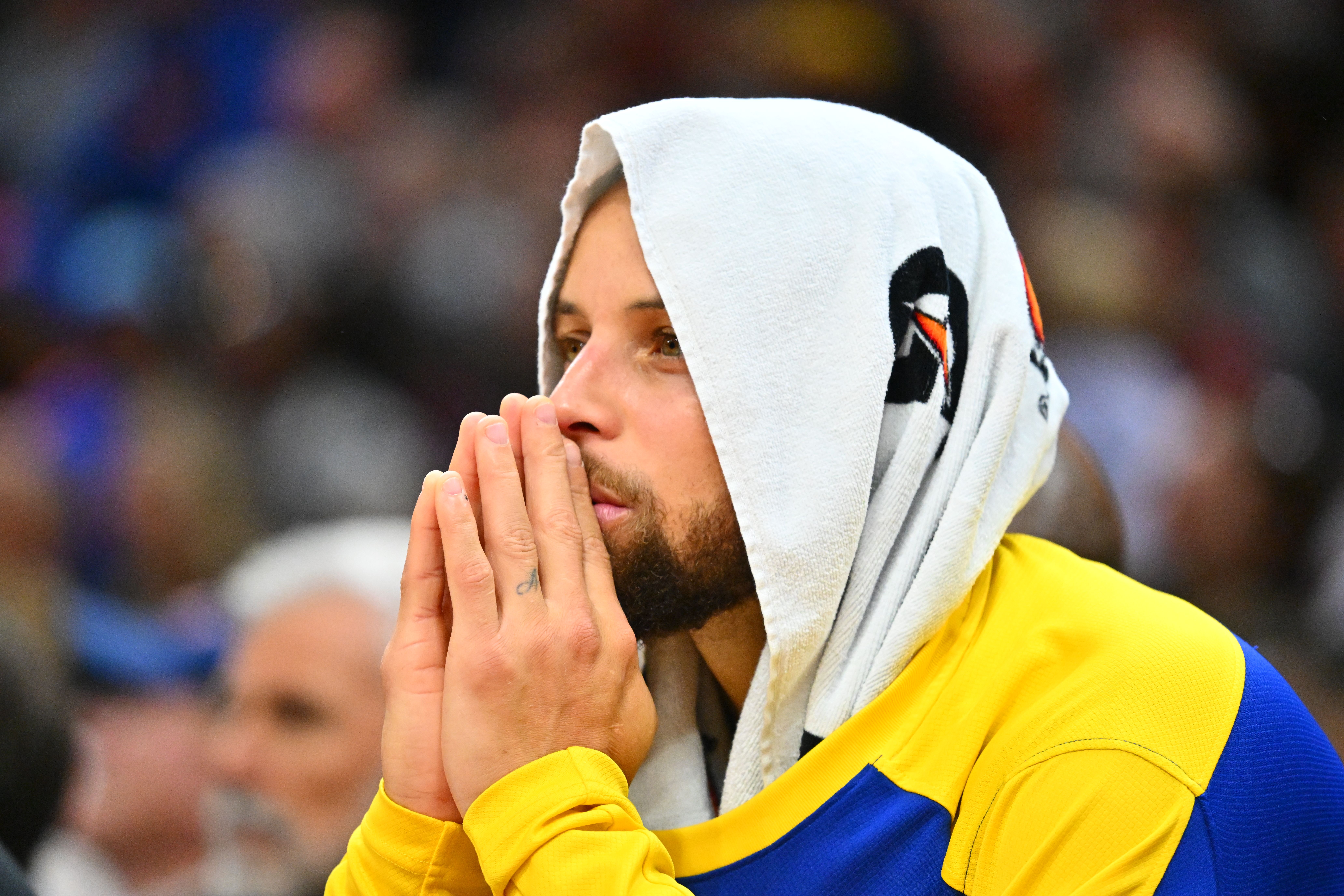 Getty Stephen Curry #30 de los Golden State Warriors se limpia la cara al final de la segunda mitad de su derrota ante los Sacramento Kings durante el Play-In Tournament en el Golden 1 Center el 16 de abril de 2024 en Sacramento, California.