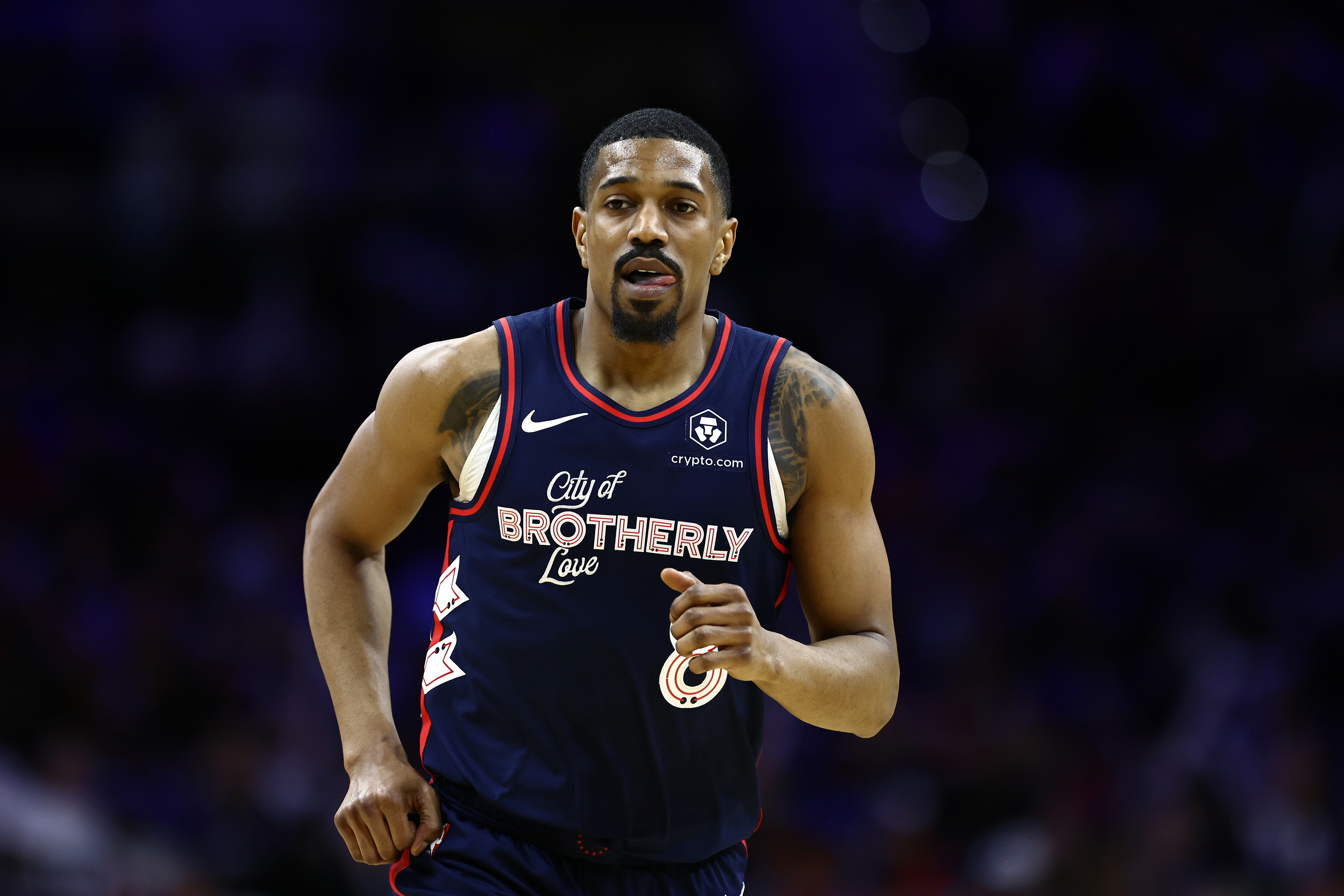 Getty FILADELFIA, PENSILVANIA – 9 DE ABRIL: De’Anthony Melton #8 de los Philadelphia 76ers observa durante el cuarto cuarto contra los Detroit Pistons en el Wells Fargo Center el 9 de abril de 2024 en Filadelfia, Pensilvania. (Foto de Tim Nwachukwu/Getty Images)