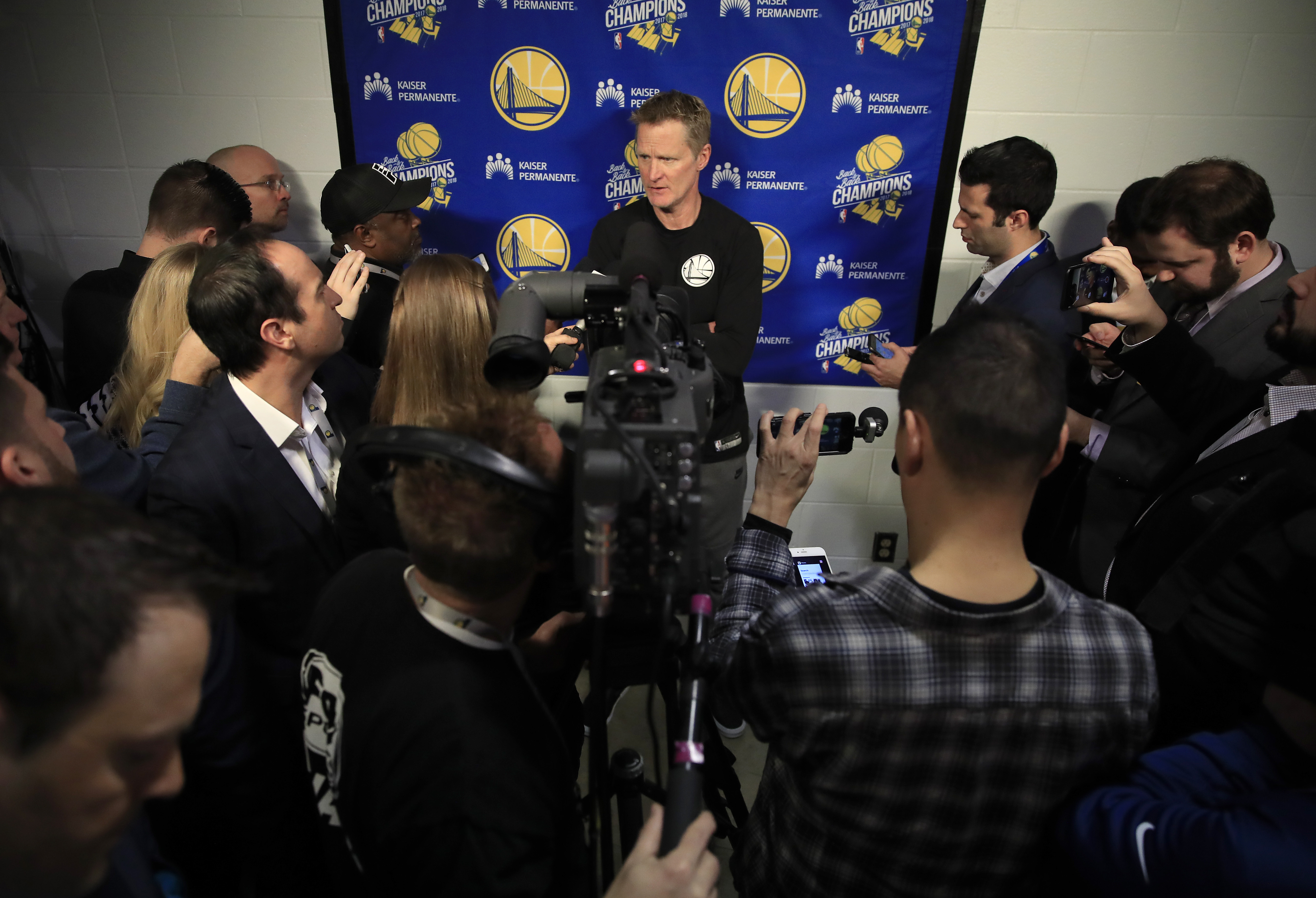 GettyINDIANÁPOLIS, INDIANA – 28 DE ENERO: Steve Kerr, entrenador de los Golden State Warriors, habla con los medios antes del partido contra los Indiana Pacers en el Bankers Life Fieldhouse el 28 de enero de 2019 en Indianápolis, Indiana. (Foto de Andy Lyons/Getty Images)