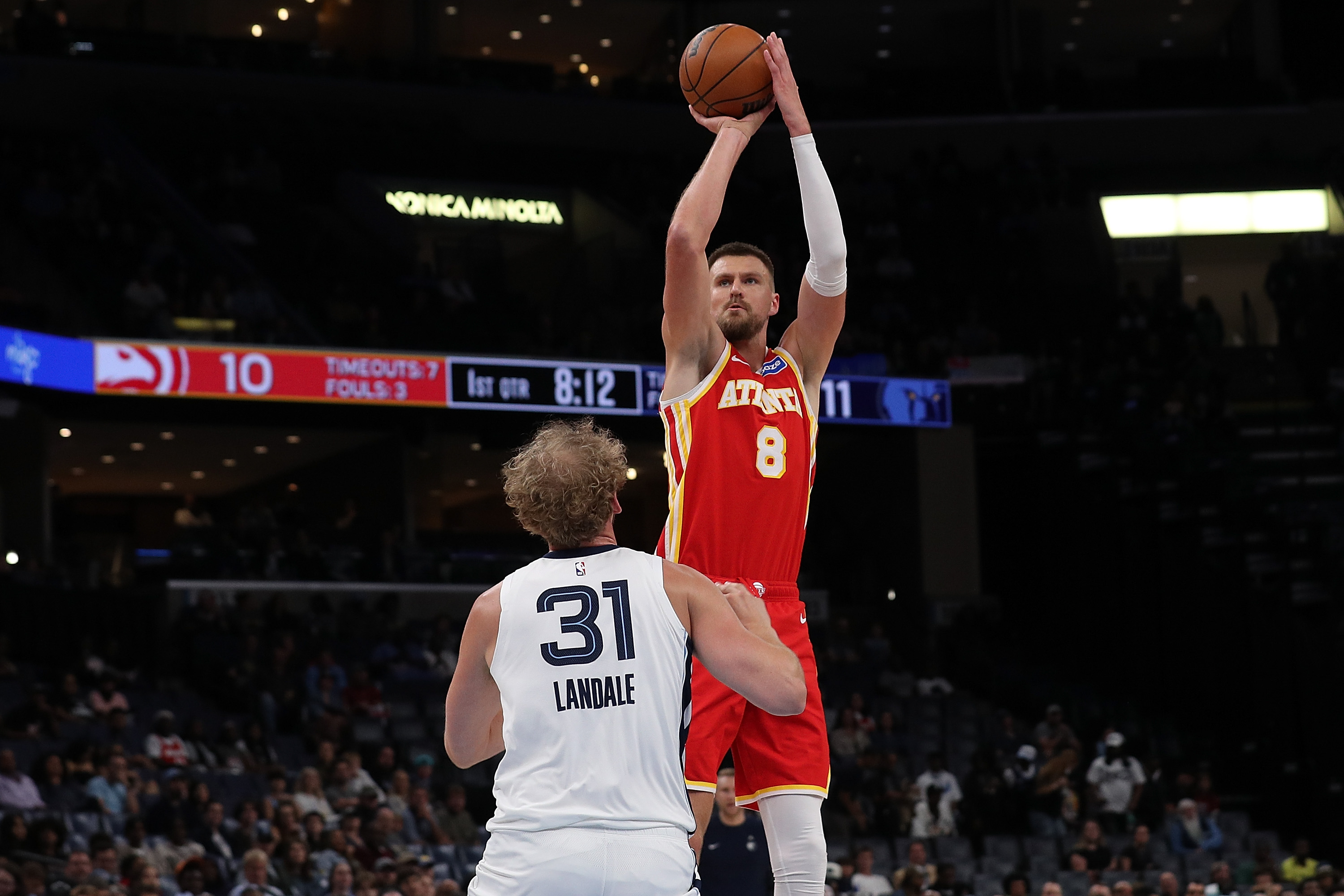 Getty MEMPHIS, TENNESSEE – 11 DE OCTUBRE: Kristaps Porziņģis, número 8 de los Atlanta Hawks, intenta un tiro contra Jock Landale , número 31 de los Memphis Grizzlies durante la primera mitad del partido de pretemporada en el FedExForum el 11 de octubre de 2025 en Memphis, Tennessee. (Foto por Justin Ford/Getty Images)