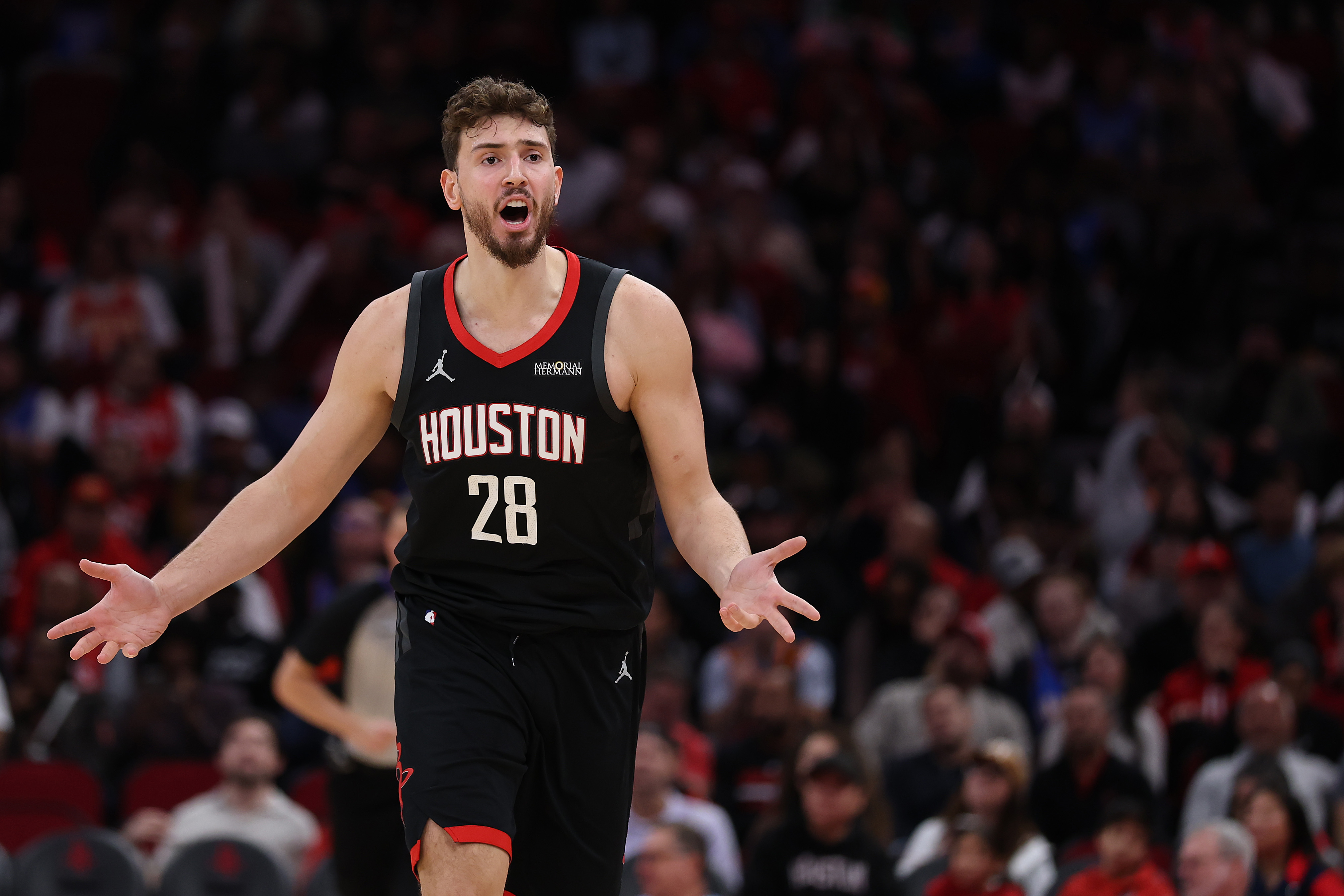 Getty HOUSTON, TEXAS – 28 DE ENERO: Alperen Sengun #28 de los Houston Rockets reacciona después de una canasta de tres puntos en la primera mitad contra los San Antonio Spurs en el Toyota Center el 28 de enero de 2026 en Houston, Texas. (Foto de Tim Warner/Getty Images)