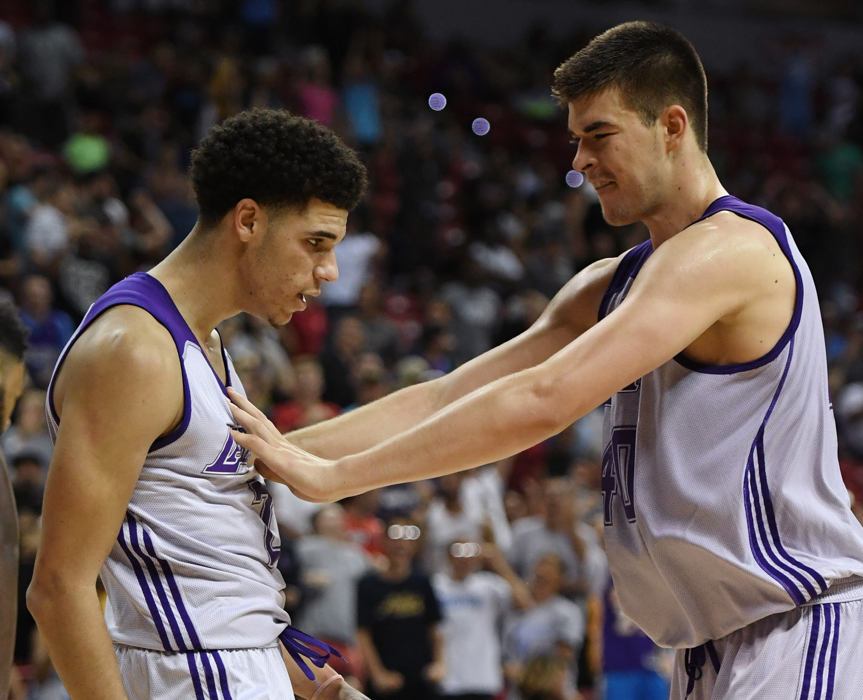 Getty LAS VEGAS, NV – 12 DE JULIO: Ivica Zubac (D) #40 de Los Angeles Lakers empuja a su compañero de equipo Lonzo Ball #2 mientras celebran la bandeja de Ball con 21 segundos restantes para empatar el juego contra los Philadelphia 76ers a 100 durante la Liga de Verano de 2017 en el Thomas & Mack Center el 12 de julio de 2017 en Las Vegas, Nevada. Los Ángeles ganó 103-102. (Foto de Ethan Miller/Getty Images)