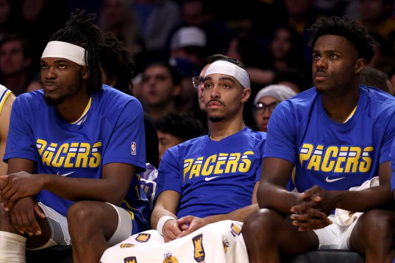 Getty Los jugadores de los Indiana Pacers, Jarace Walker, Andrew Nembhard y Kobe Brown, se sientan en el banquillo. (Foto de Katelyn Mulcahy/Getty Images)