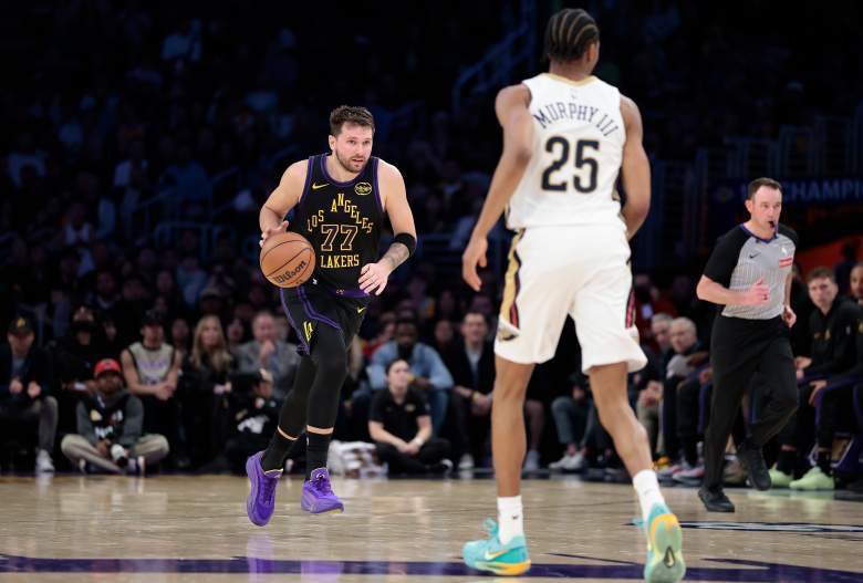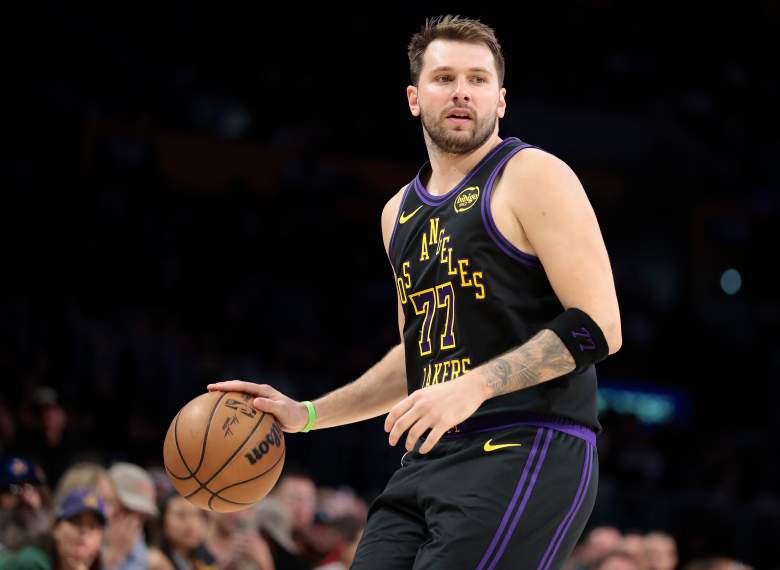 Getty El base de Los Angeles Lakers, Luka Doncic, dribla el balón por la cancha. (Foto de Ronald Martinez/Getty Images)