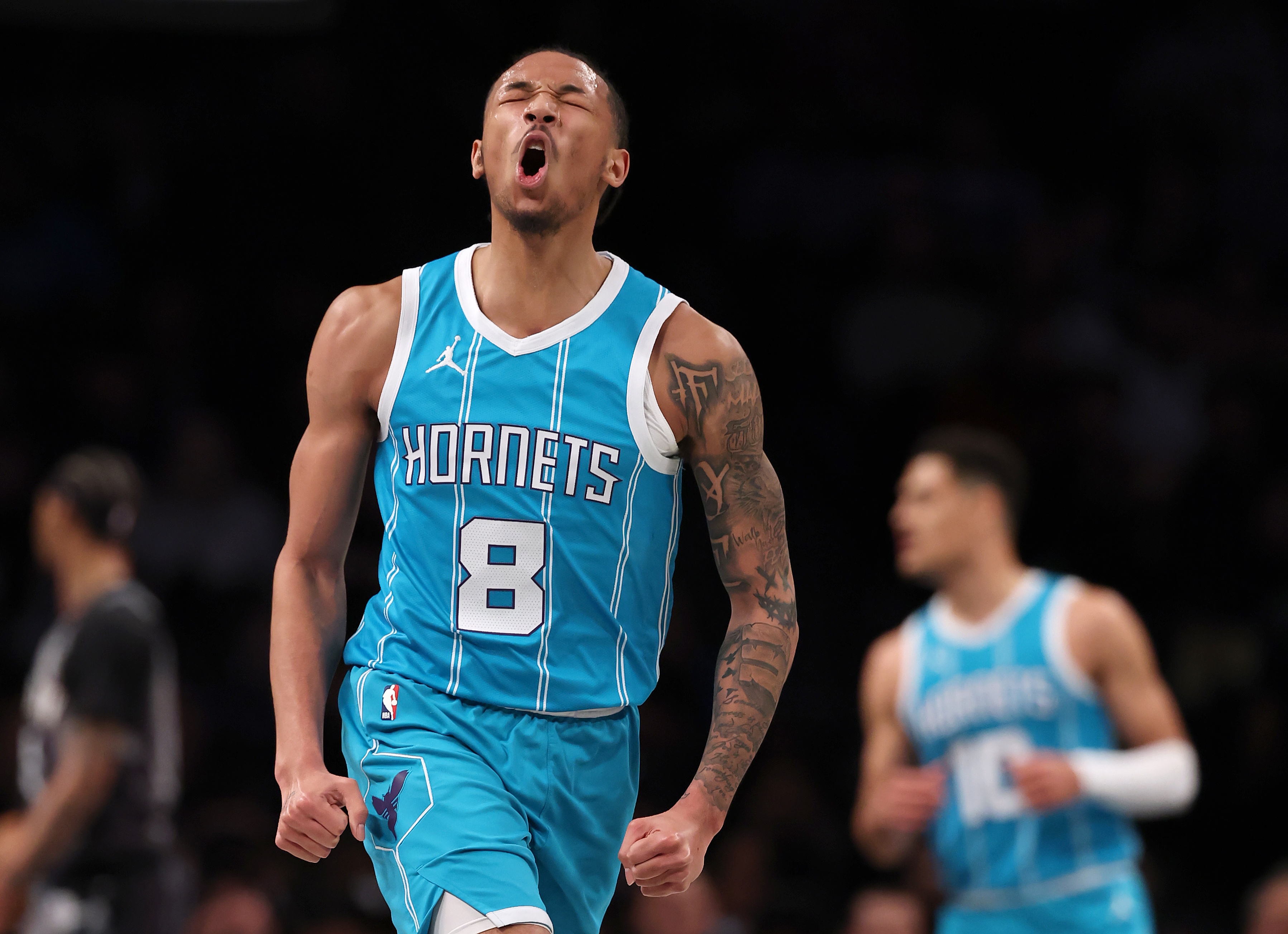 Getty Nick Smith Jr. de los Charlotte Hornets celebra su tiro de tres puntos en la primera mitad contra los Brooklyn Nets en el Barclays Center el 10 de febrero de 2025 en el distrito de Brooklyn de la ciudad de Nueva York.