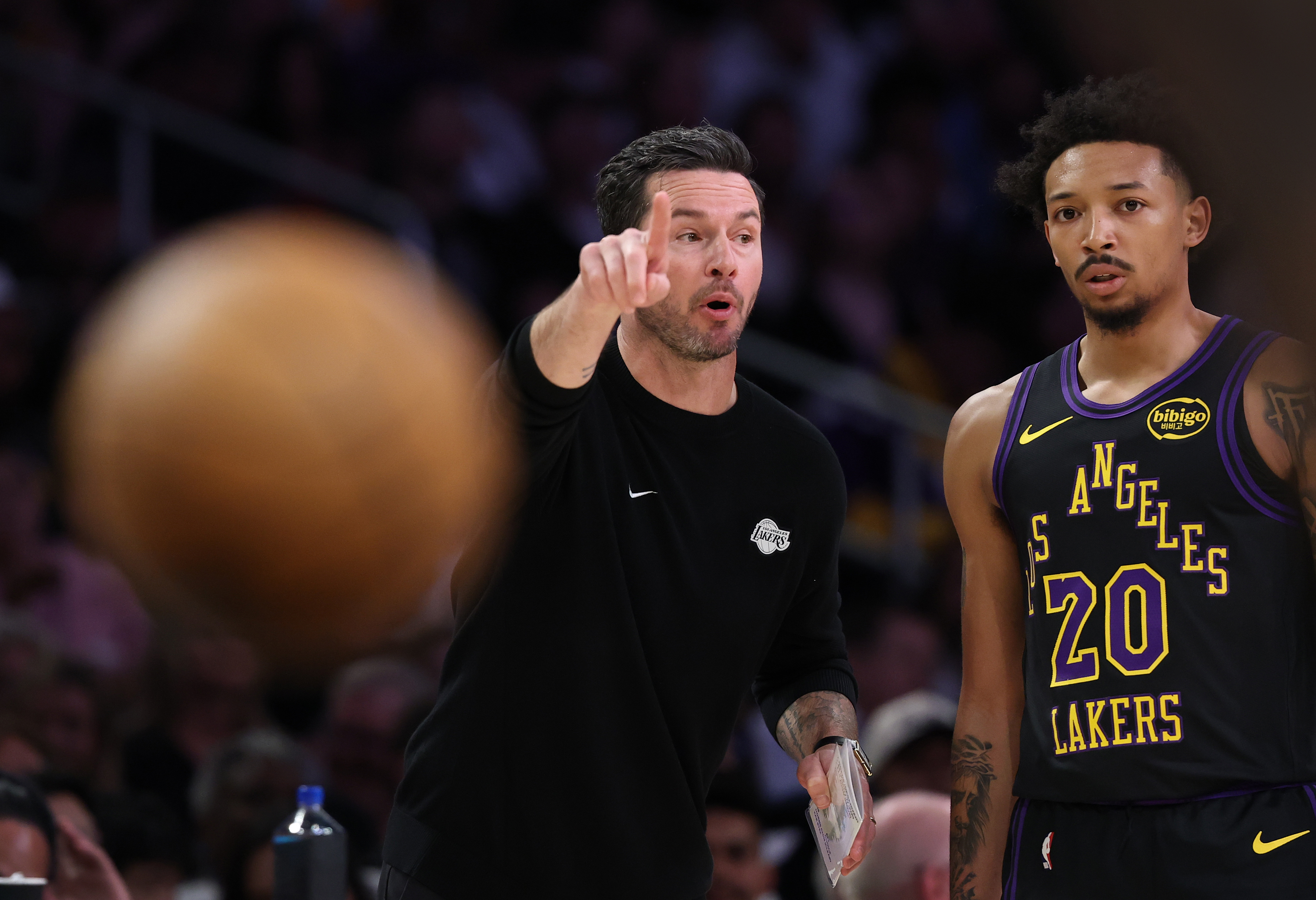 Getty } El entrenador de los Lakers JJ Redick , a la izquierda, entrena al base de los Lakers, Nick Smith Jr., #20, contra los Suns en el Crypto.com Arena en Los Ángeles el viernes 10 de abril de 2026.