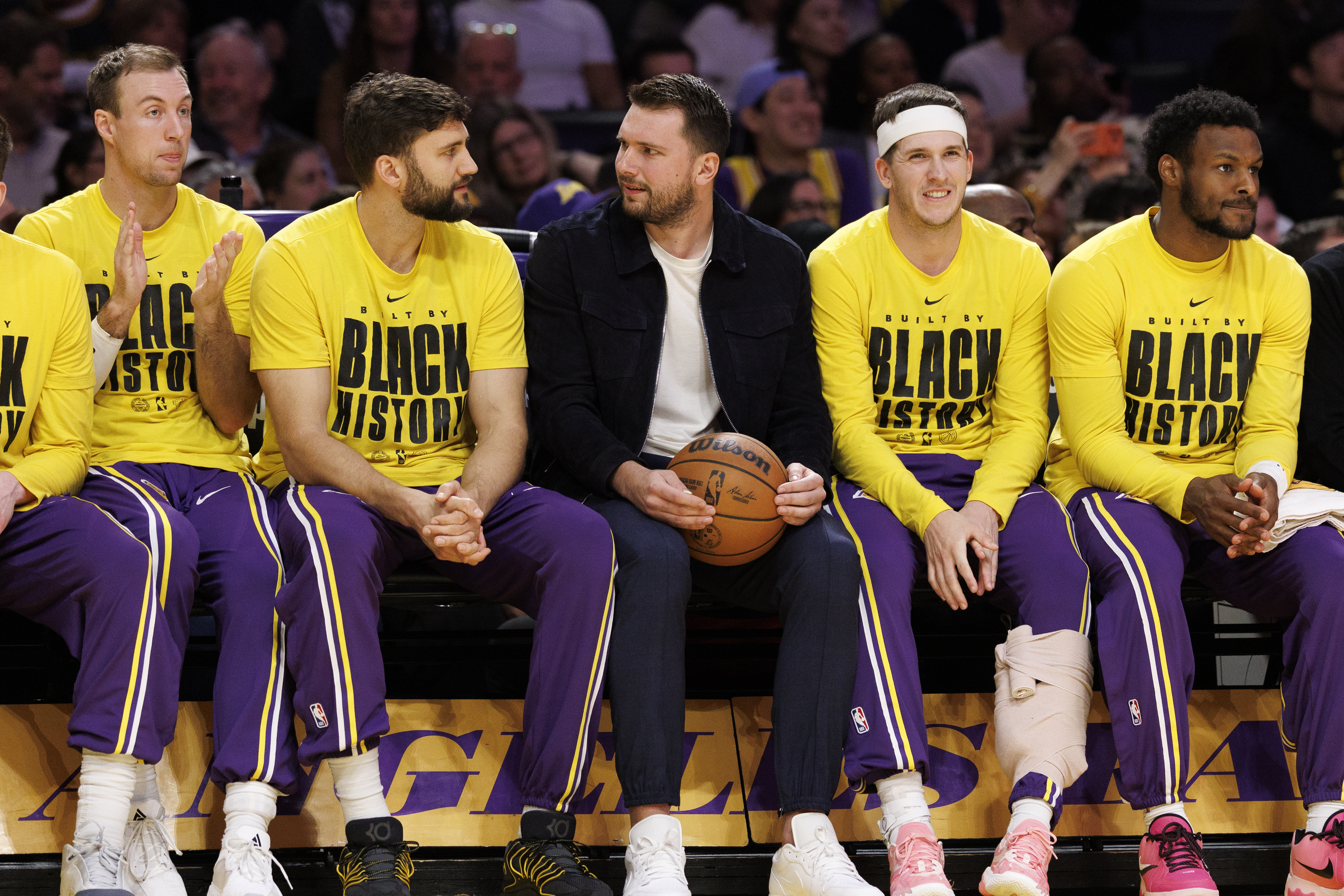 Getty LOS ÁNGELES, CA – 9 DE FEBRERO DE 2026: El base lesionado de Los Angeles Lakers, Luka Doncic (77), se sienta con ropa de calle en el banco entre el alero de Los Angeles Lakers, Maxi Kleber (14), y el base de Los Angeles Lakers Austin Reaves (15), a la derecha, durante el juego contra el Oklahoma City Thunder en el Crypto.com Arena el 79 de febrero de 2026 en Los Ángeles, California.(Gina Ferazzi / Los Angeles Times vía Getty Images)