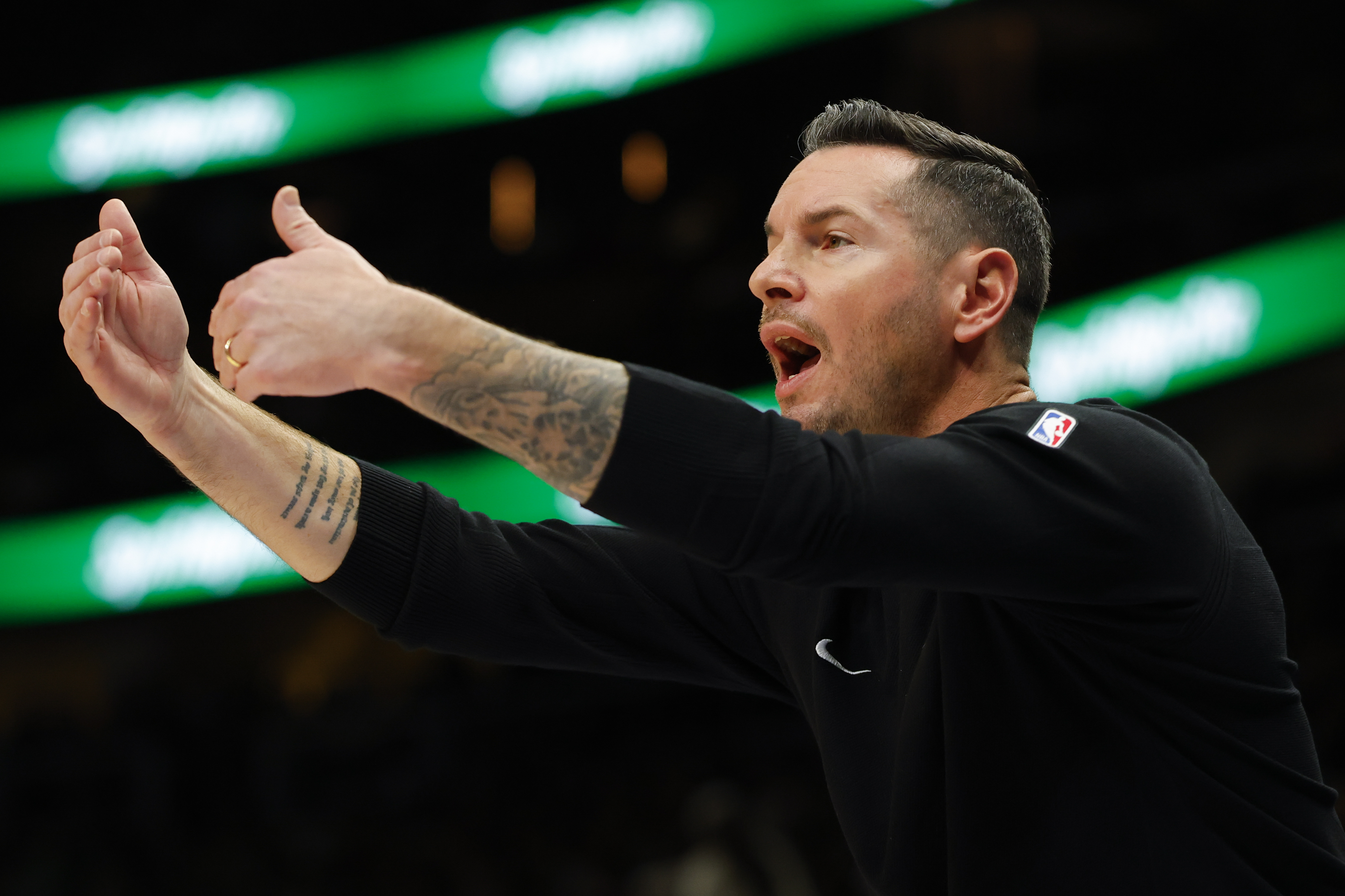 Getty El entrenador en jefe JJ Redick de Los Angeles Lakers reacciona durante el segundo cuarto contra los Atlanta Hawks en el State Farm Arena el 6 de diciembre de 2024 en Atlanta, Georgia.