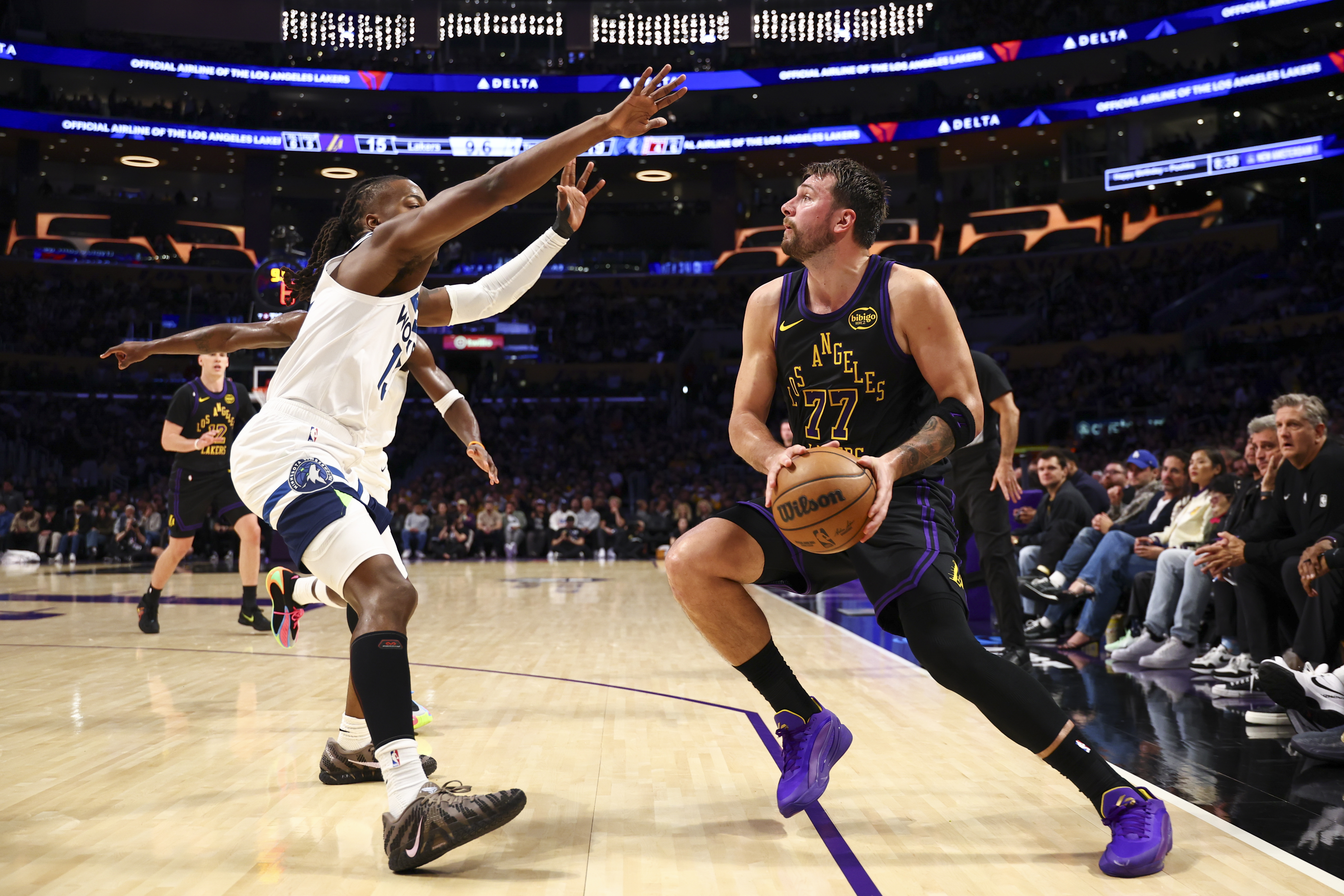 Getty LOS ÁNGELES, CALIFORNIA – 10 DE MARZO: Luka Doncic #77 de Los Angeles Lakers maneja el balón contra Ayo Dosunmu #13 de Minnesota Timberwolves durante la primera mitad en Crypto.com Arena el 10 de marzo 10 de octubre de 2026 en Los Ángeles, California. (Foto de Melina Pizano/Getty Images)