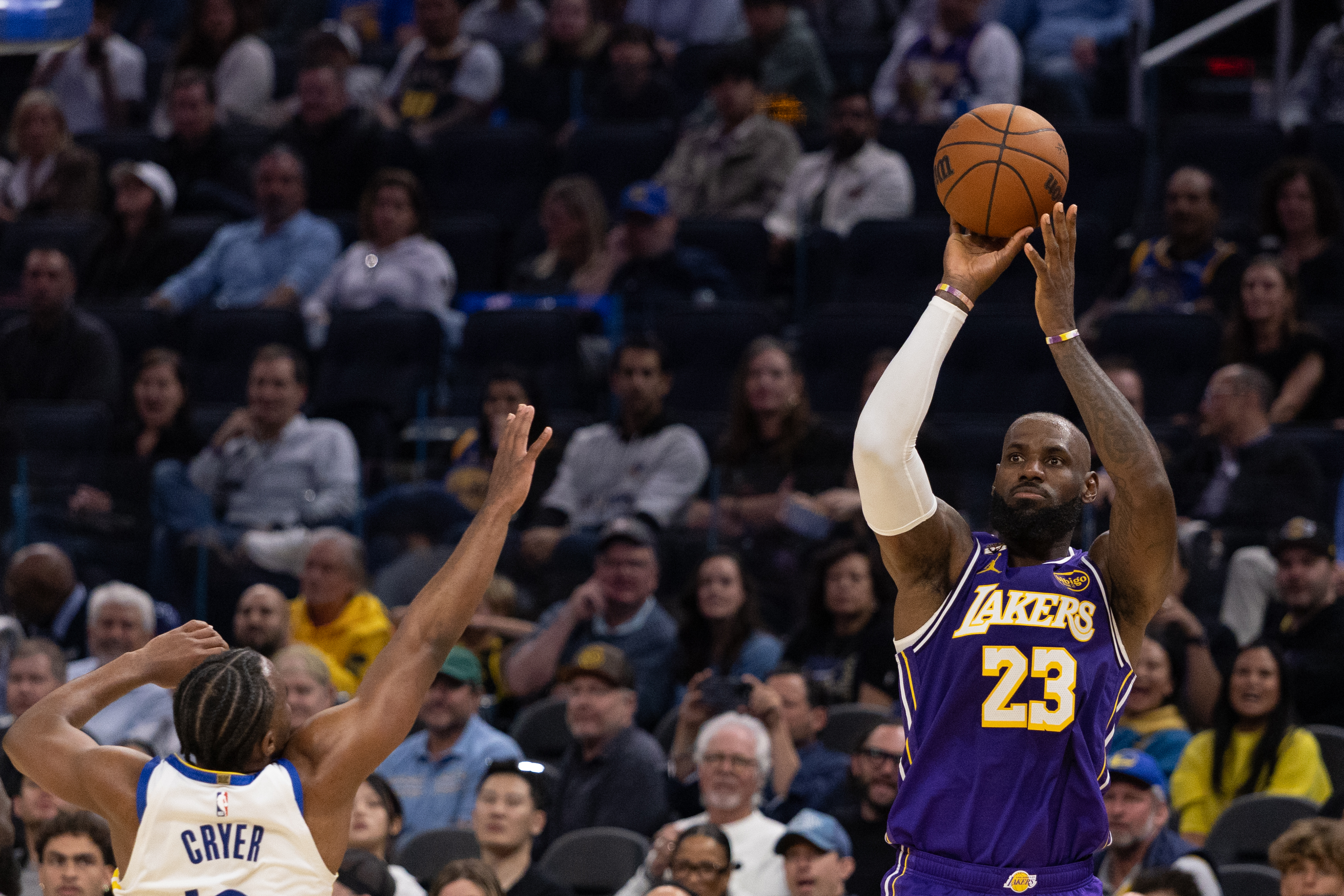 Getty El alero LeBron James #23 de Los Angeles Lakers lanza un tiro en suspensión en el segundo cuarto del partido contra los Golden State Warriors en el Chase Center el jueves 9 de abril de 2026 en San Francisco, CA.