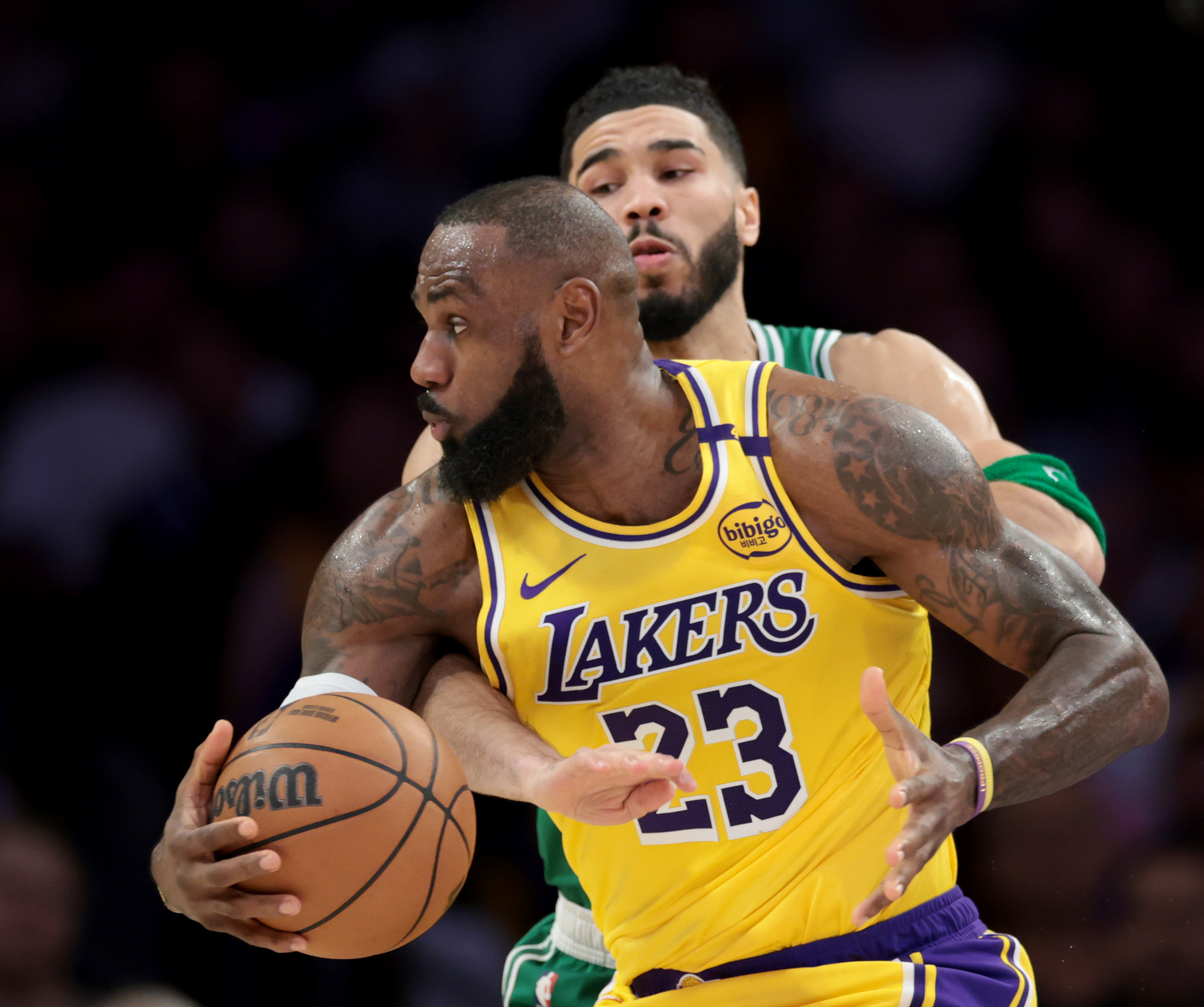Getty LOS ÁNGELES, CALIFORNIA – 23 DE ENERO: LeBron James #23 de los Los Angeles Lakers defiende a Jayson Tatum #0 de los Boston Celtics del balón durante una victoria de los Lakers por 117-96 en el Crypto.com Arena el 23 de enero de 2025 en Los Ángeles, California. (Foto de Harry How/Getty Images)
