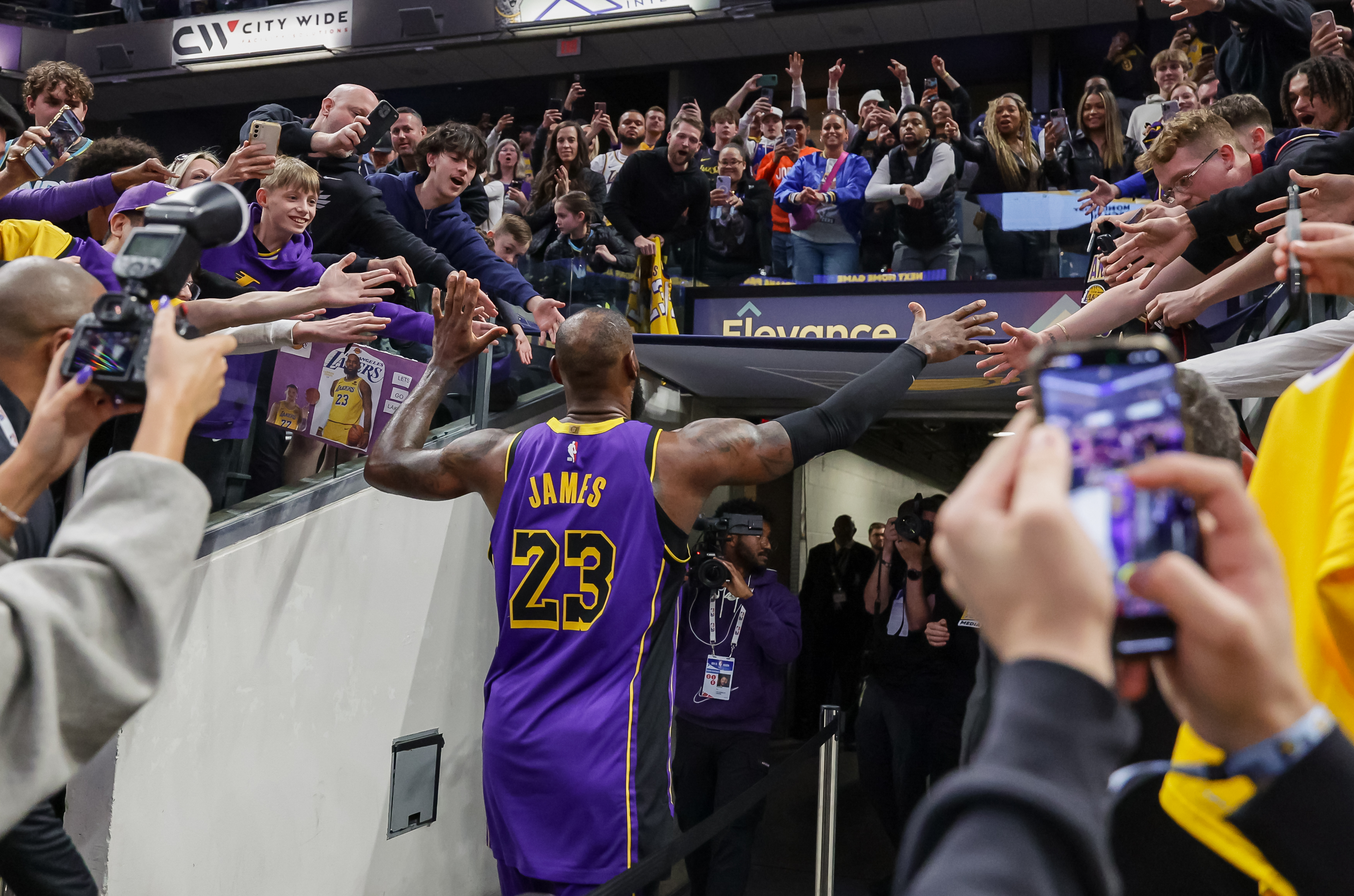 Getty INDIANÁPOLIS, INDIANA – 26 DE MARZO: LeBron James #23 de Los Angeles Lakers saluda a los aficionados tras el partido contra los Indiana Pacers en el Gainbridge Fieldhouse el 26 de marzo de 2025 en Indianápolis, Indiana. (Foto de Michael Hickey/Getty Images)