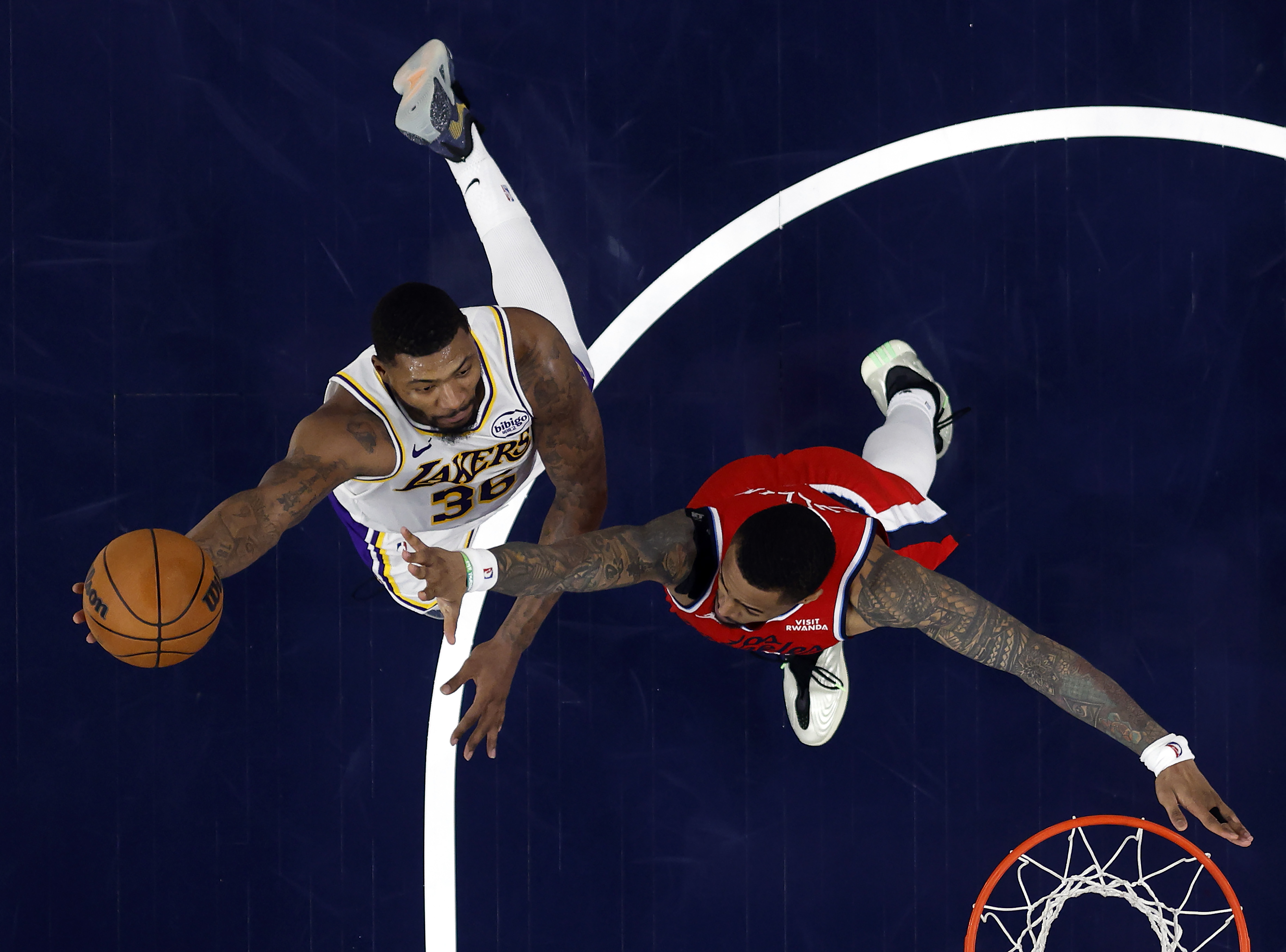 Getty INGLEWOOD, CALIFORNIA – 20 DE DICIEMBRE: Marcus Smart #36 de Los Angeles Lakers lanza un tiro contra John Collins #20 de Los Angeles Clippers en la primera mitad en el Intuit Dome el 20 de diciembre de 2025 en Inglewood, California. (Foto de Ronald Martinez/Getty Images)
