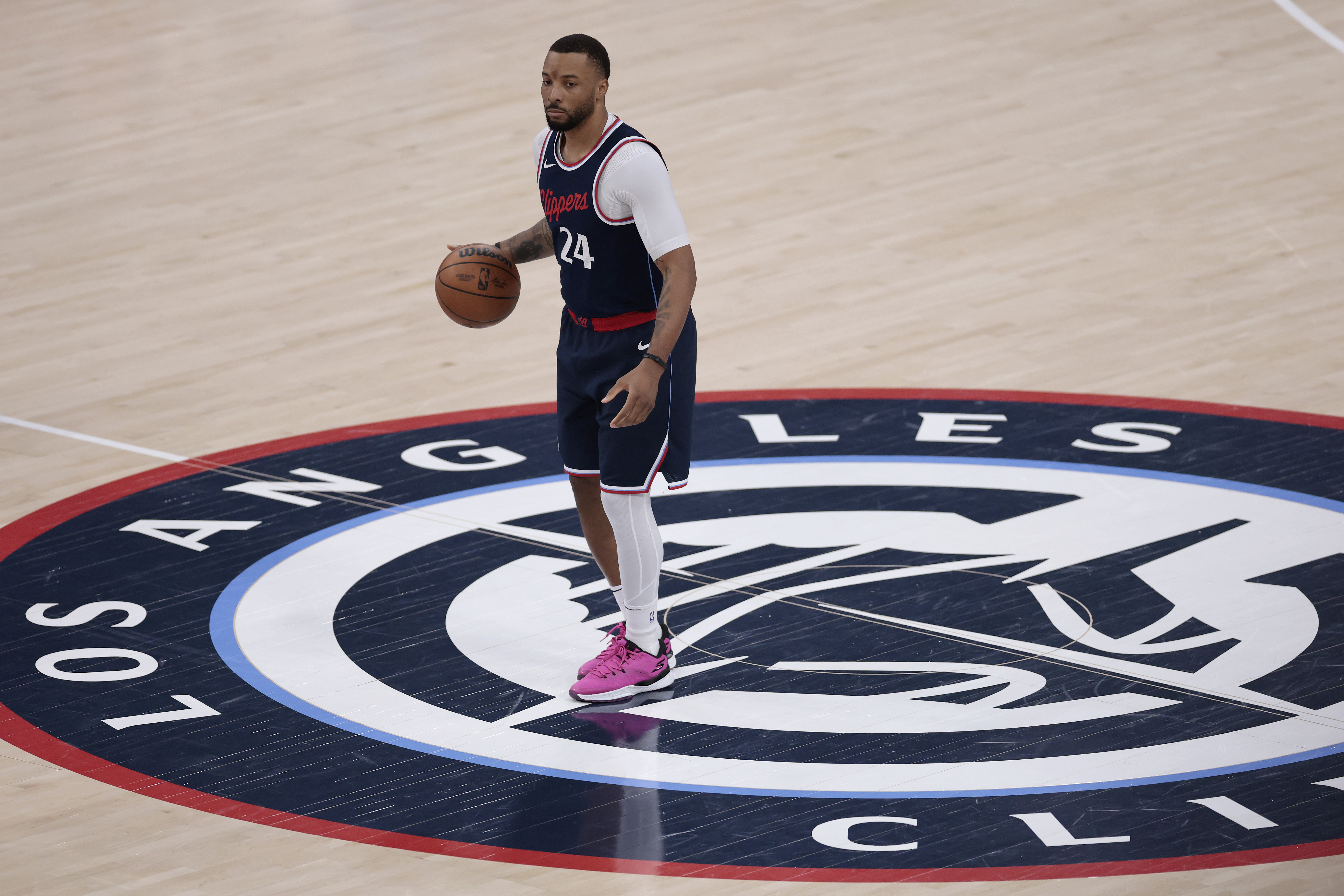 Getty INGLEWOOD, CALIFORNIA – 24 DE ABRIL: Norman Powell #24 de Los Angeles Clippers dribla el balón contra los Denver Nuggets durante el primer cuarto del Juego Tres de la Primera Ronda de los Playoffs de la Conferencia Oeste de la NBA en el Intuit Dome el 24 de abril de 2025 en Inglewood, California. (Foto de Ronald Martinez/Getty Images)