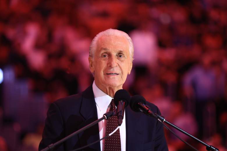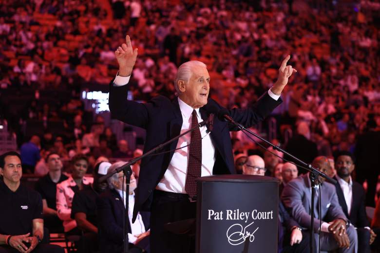 GettyEl presidente de Miami Heat, Pat Riley, habla con la multitud durante un partido. (Foto de Carmen Mandato/Getty Images)
