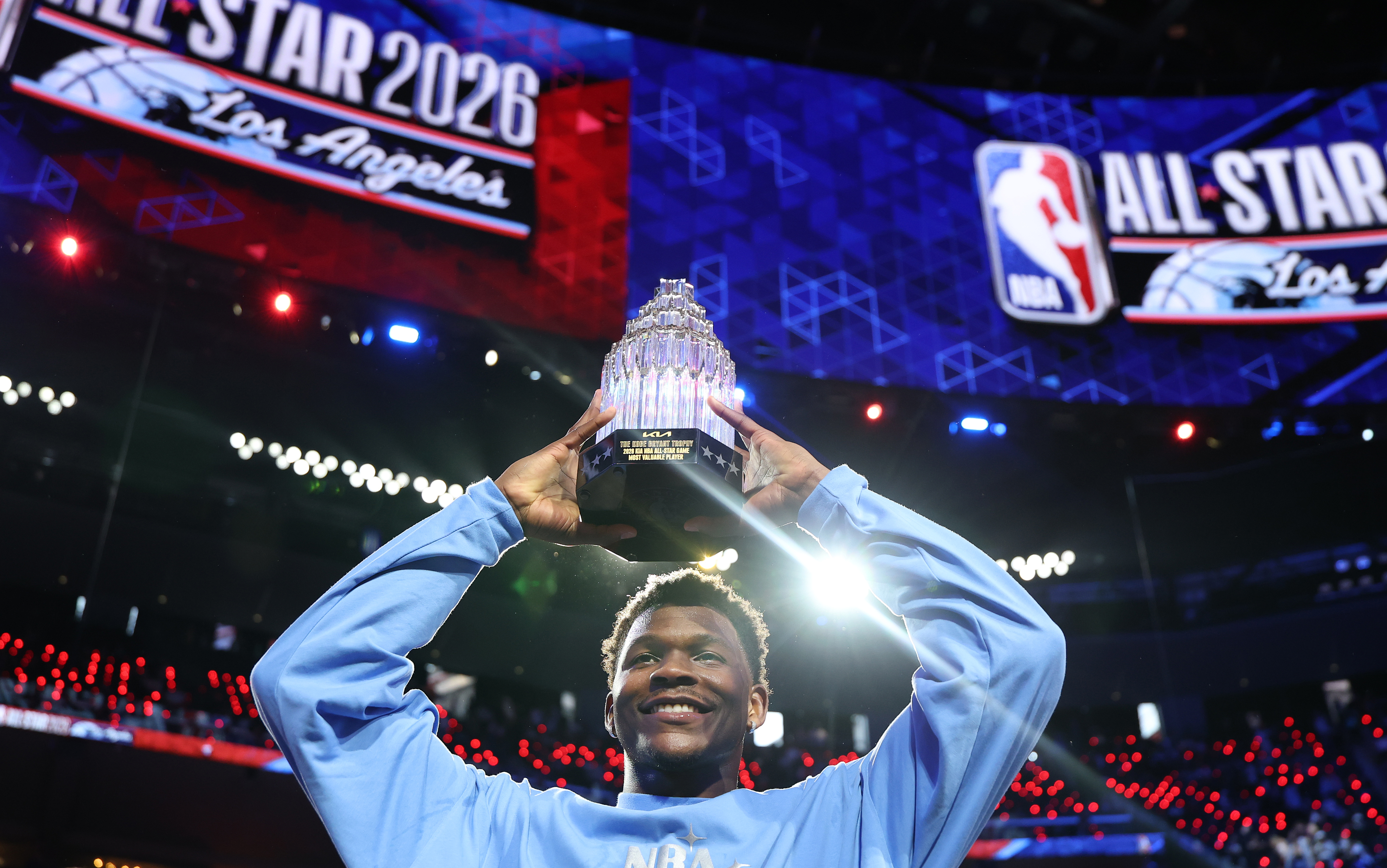 Getty Inglewood, CA – 15 de febrero: El MVP del Team USA Stars, Anthony Edwards, levanta el Trofeo Kobe Bryant al MVP después de su victoria por 47-21 sobre USA Stripes en el séptimo Juego de las Estrellas de la NBA en el Intuit Dome en Inglewood el domingo 15 de febrero de 2026. (Allen J. Schaben / Los Angeles Times vía Getty Images)