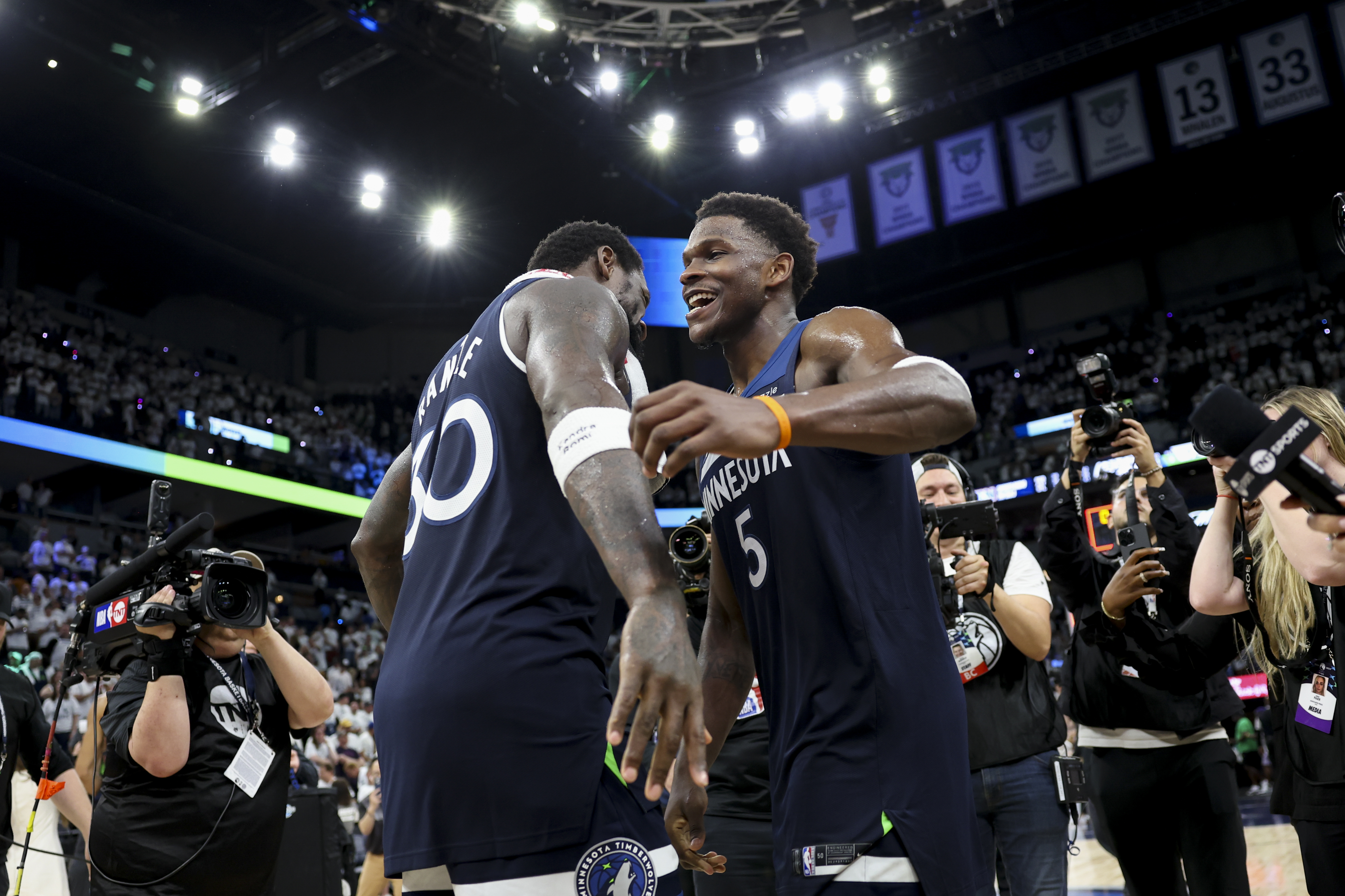 Getty MINNEAPOLIS, MINNESOTA – 14 de mayo: Julius Randle #30 y Anthony Edwards #5 de los Minnesota Timberwolves celebran tras ganar el quinto partido de la segunda ronda de los playoffs de la NBA de la Conferencia Oeste contra los Golden State Warriors en el Target Center el 14 de mayo de 2025 en Minneapolis, Minnesota. (Foto de Ellen Schmidt/Getty Images)