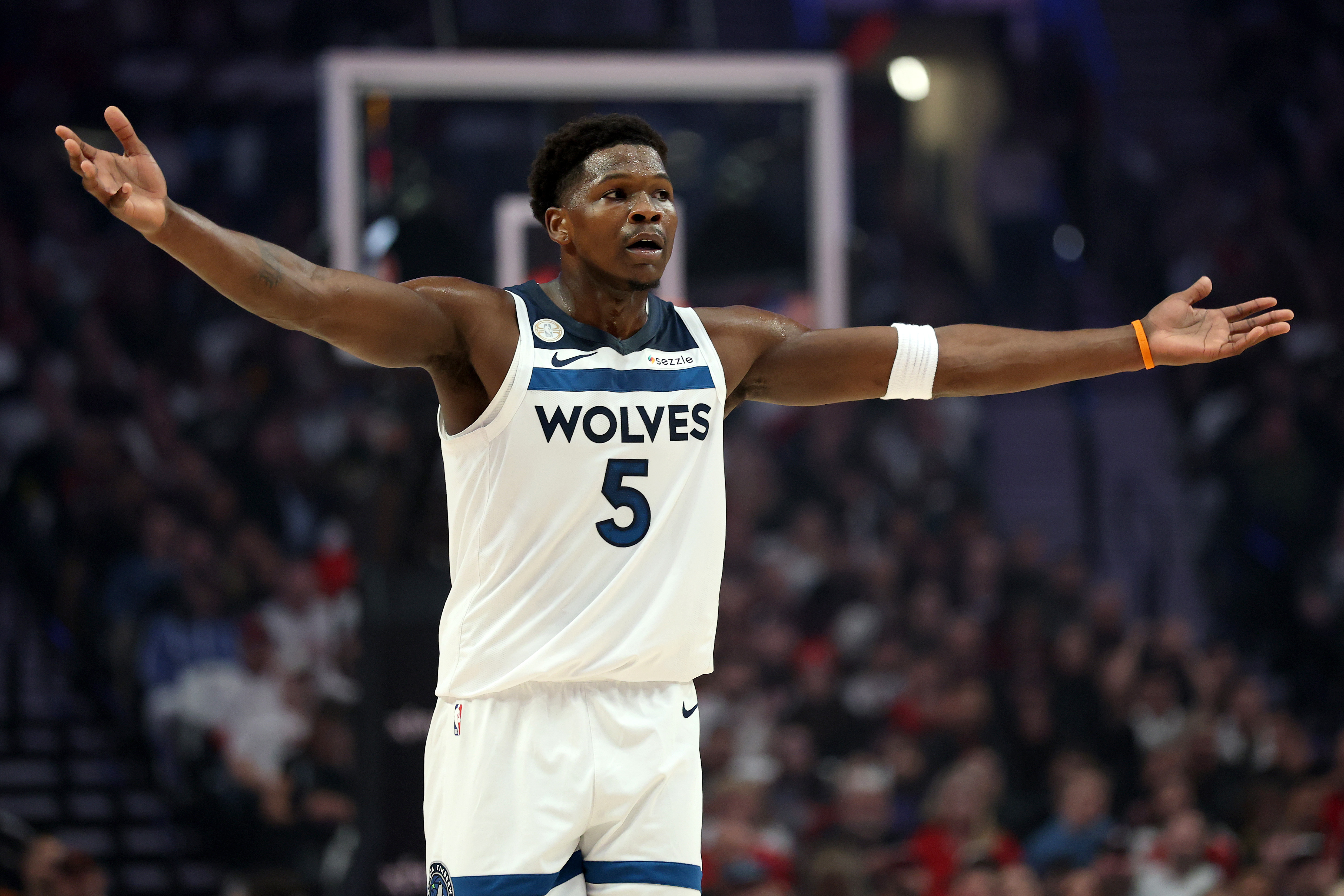 GettyPORTLAND, OREGÓN &–ash; 22 DE OCTUBRE: Anthony Edwards #5 de los Minnesota Timberwolves reacciona contra los Portland Trail Blazersen Moda Center el 22 de octubre de 2025 en Portland, Oregón. (Foto de Steph Chambers/Getty Images)