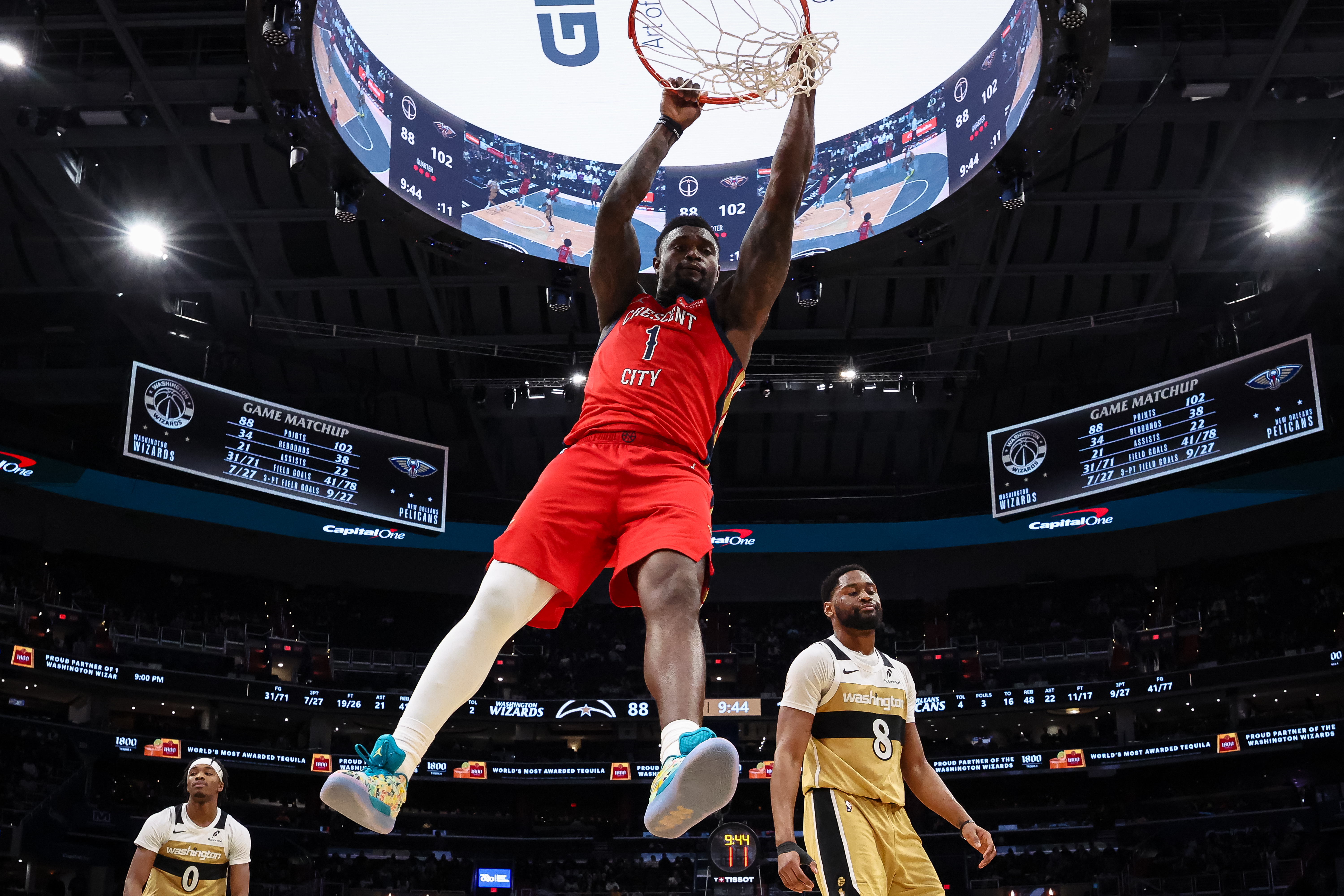 GettyZion Williamson #1 de los New Orleans Pelicans se cuelga del aro después de hacer un mate contra los Washington Wizards durante la segunda mitad en el Capital One Arena el 9 de enero de 2026 en Washington, DC.