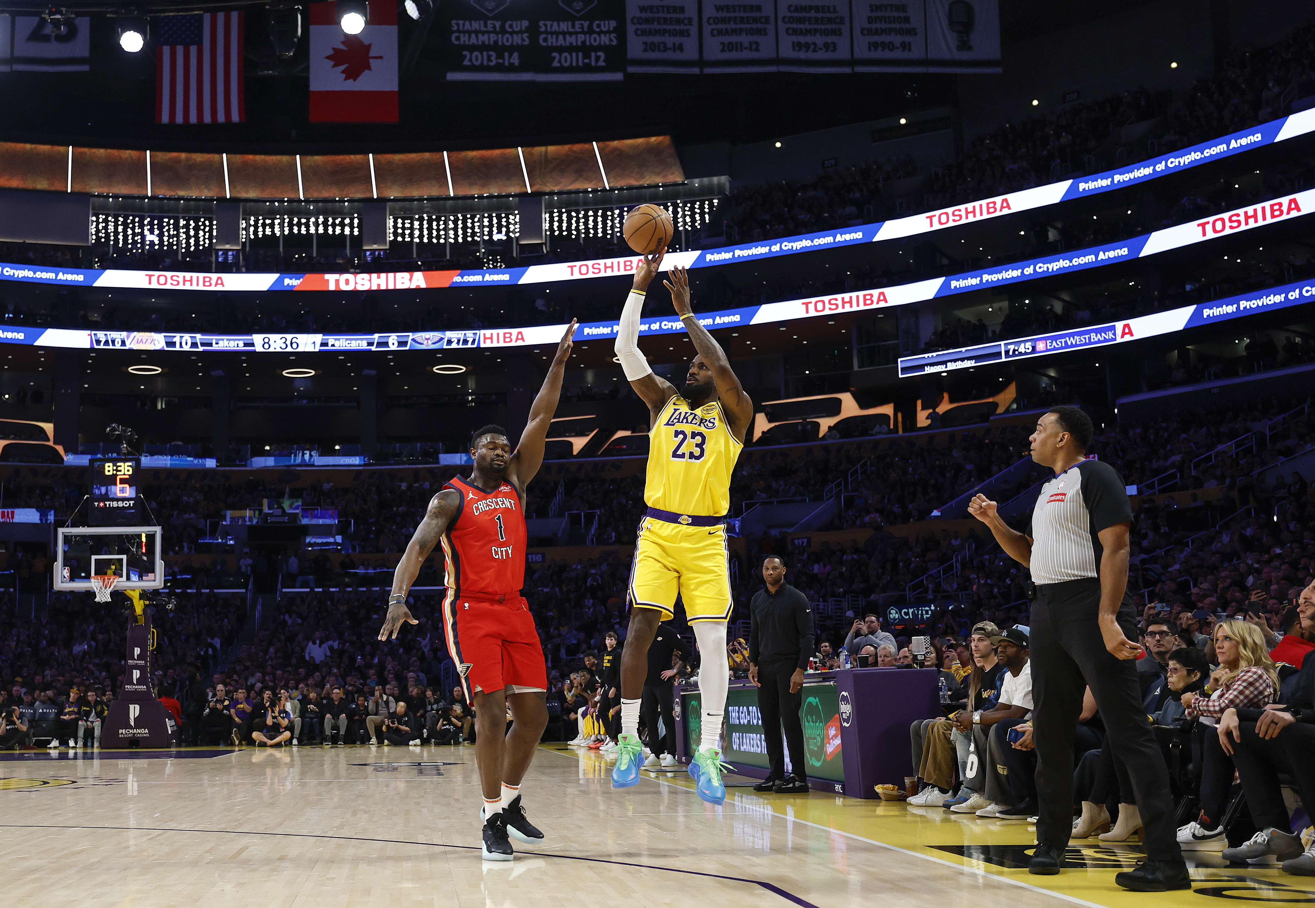 Getty LOS ÁNGELES, CALIFORNIA – 4 DE MARZO: LeBron James #23 de Los Angeles Lakers lanza una canasta de 3 puntos para anotar sus 50,002 puntos en la temporada regular y playoffs de la NBA durante la primera mitad contra Zion Williamson #1 de los New Orleans Pelicans en el Crypto.com Arena el 4 de marzo de 2025 en Los Ángeles, California. (Foto de Ronald Martinez/Getty Images)