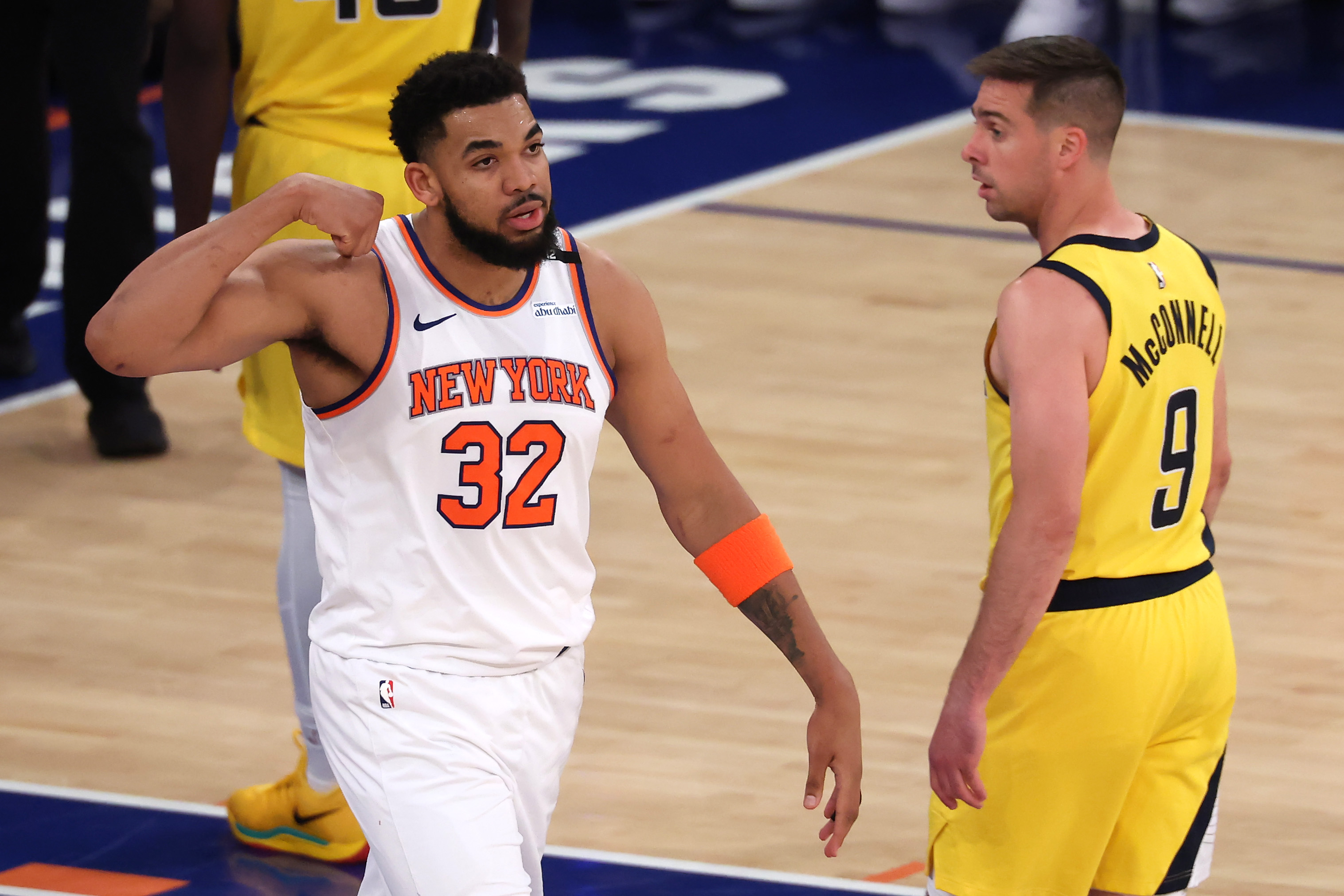 Getty NUEVA YORK, NUEVA YORK – 23 DE MAYO: Karl-Anthony Towns #32 de los New York Knicks celebra una canasta contra TJ McConnell #9 de los Indiana Pacers durante el segundo período en el Juego Dos de las Finales de la Conferencia Este de los Playoffs de la { en el Madison Square Garden el 23 de mayo de 2025 en la ciudad de Nueva York. (Foto de Elsa/Getty Images)