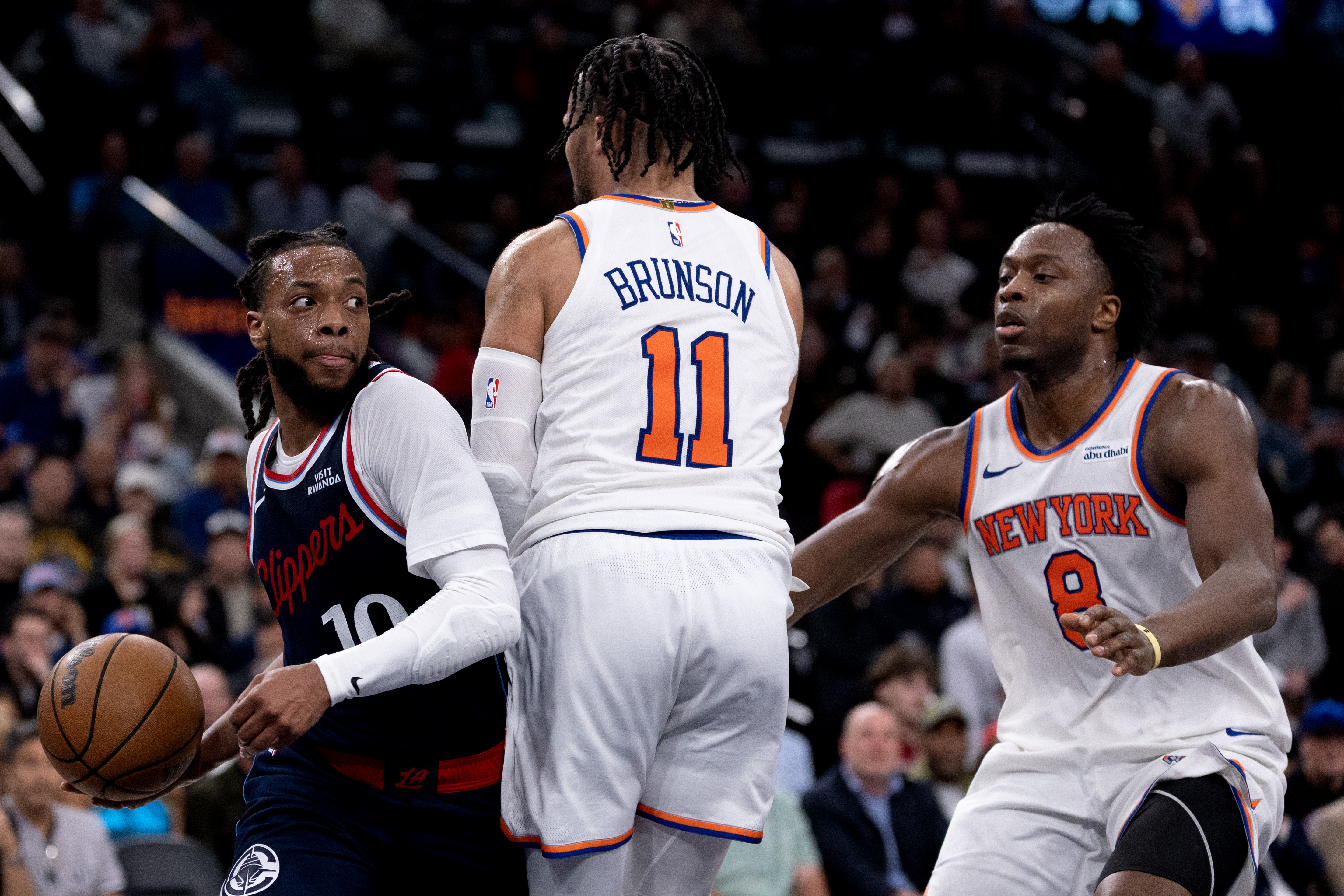 Getty Inglewood, CA – 9 de marzo: El escolta de los LA Clippers Darius Garland (10) dribla alrededor del escolta de los New York Knicks, Jalen Brunson (11), y el alero Og Anunoby (8) durante la segunda mitad de un partido de baloncesto de la NBA en el Intuit Dome el lunes 9 de marzo de 2026 en Inglewood, CA. (Eric Thayer / Los Angeles Times vía Getty Images)