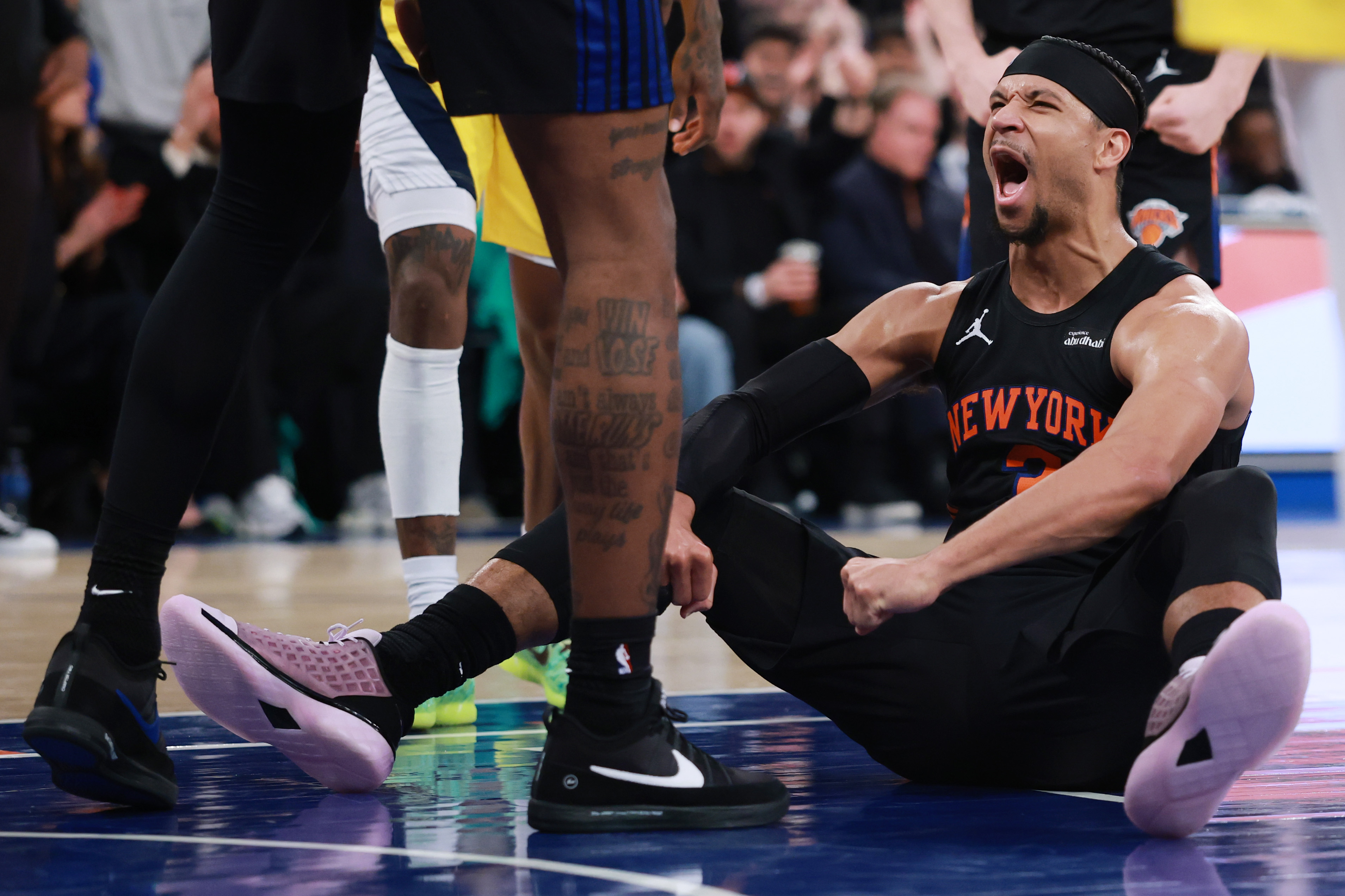 Getty NUEVA YORK, NUEVA YORK – 17 DE MARZO: El base Josh Hart #3 de los New York Knicks reacciona con el pívot Mitchell Robinson #23 y el base Tyler Kolek #13 durante la segunda mitad contra los Indiana Pacers en el Madison Square Garden el 17 de marzo de 2026 en la ciudad de Nueva York. Los Knicks ganaron 136-110. (Foto de Sarah Stier/Getty Images)