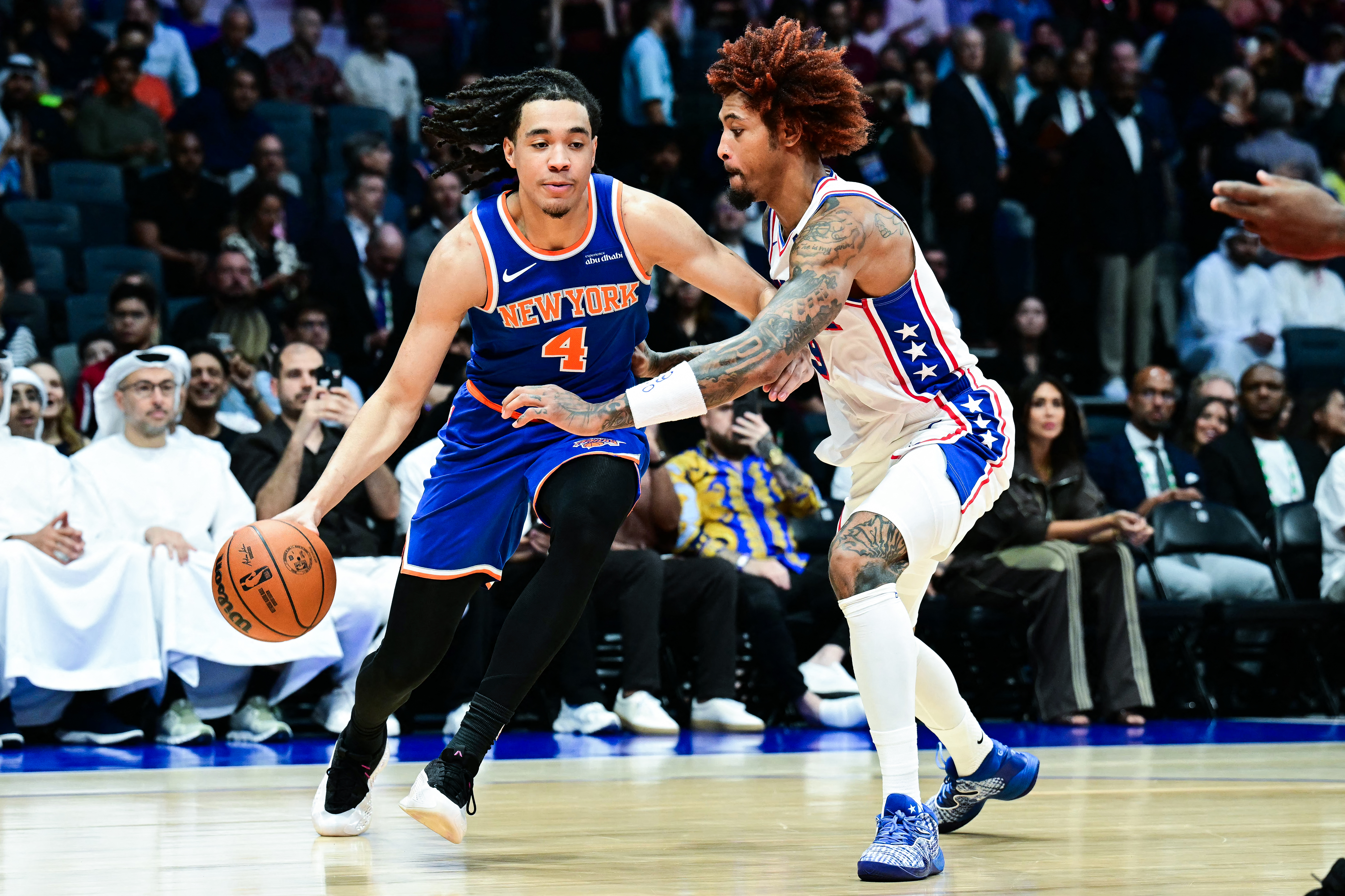 Getty Pacome Dadiet, número de los New York Knicks, dribla contra Kelly Oubre los Philadelphia 76ers, durante el partido de baloncesto de la NBA entre los New York Knicks y los Philadelphia 76ers en el Etihad Arena de Abu Dabi el 2 de octubre de 2025. (Foto de Giuseppe CACACE / AFP vía Getty Images)