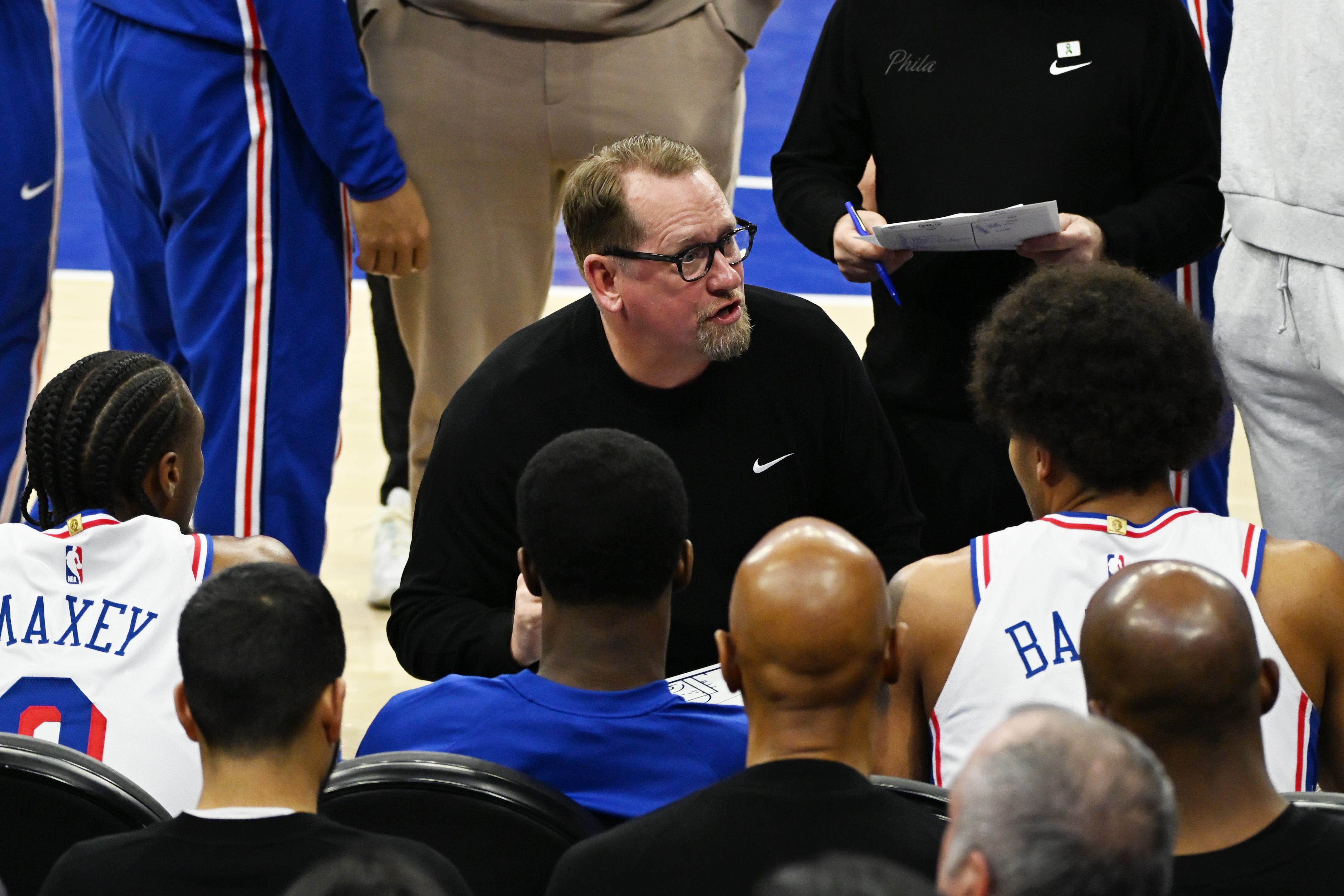 Getty FILADELFIA, PENSILVANIA – 20 DE ENERO: El entrenador en jefe de los Philadelphia 76ers, Nick Nurse, habla con el equipo durante un tiempo muerto durante la primera mitad contra los Phoenix Suns en Xfinity Mobile Arena el 20 de enero de 2026 en Filadelfia, Pensilvania. (Foto de Arwen Clemans/Getty Images)