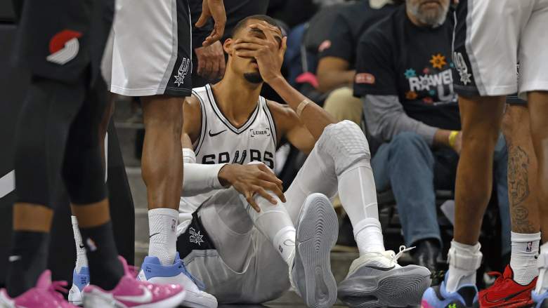 Getty Victor Wembanyama se sujeta la cabeza después de caer a la cancha