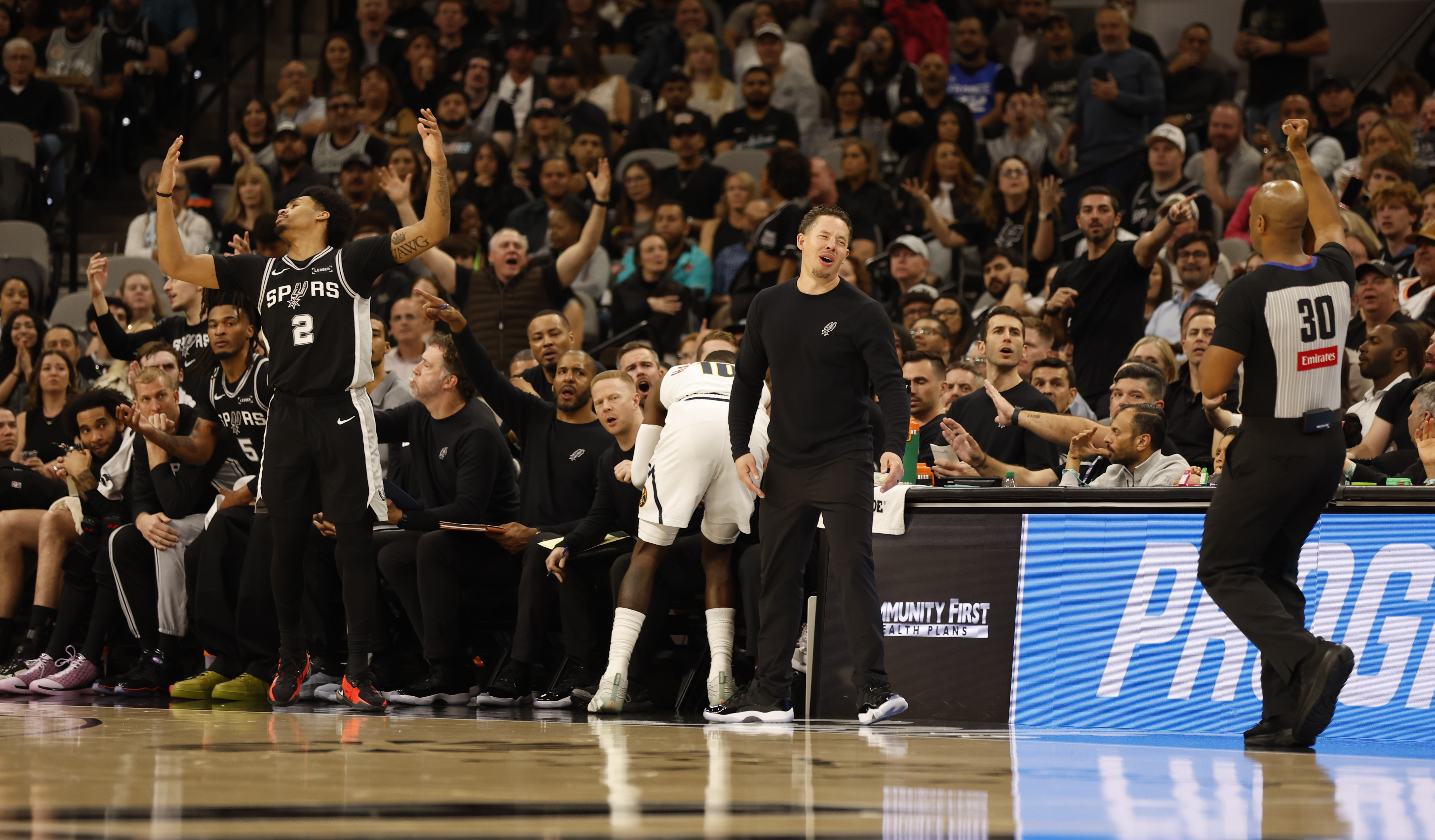 SAN ANTONIO, TX – 12 DE MARZO: Mitch Johnson, entrenador de los San Antonio Spurs, reacciona después de una falta pitada a Dylan Harper #2 contra los Denver Nuggets en la primera mitad en el Frost Bank Center el 12 de marzo de 2026 en San Antonio, Texas. (Foto de Ronald Cortes/Getty Images)