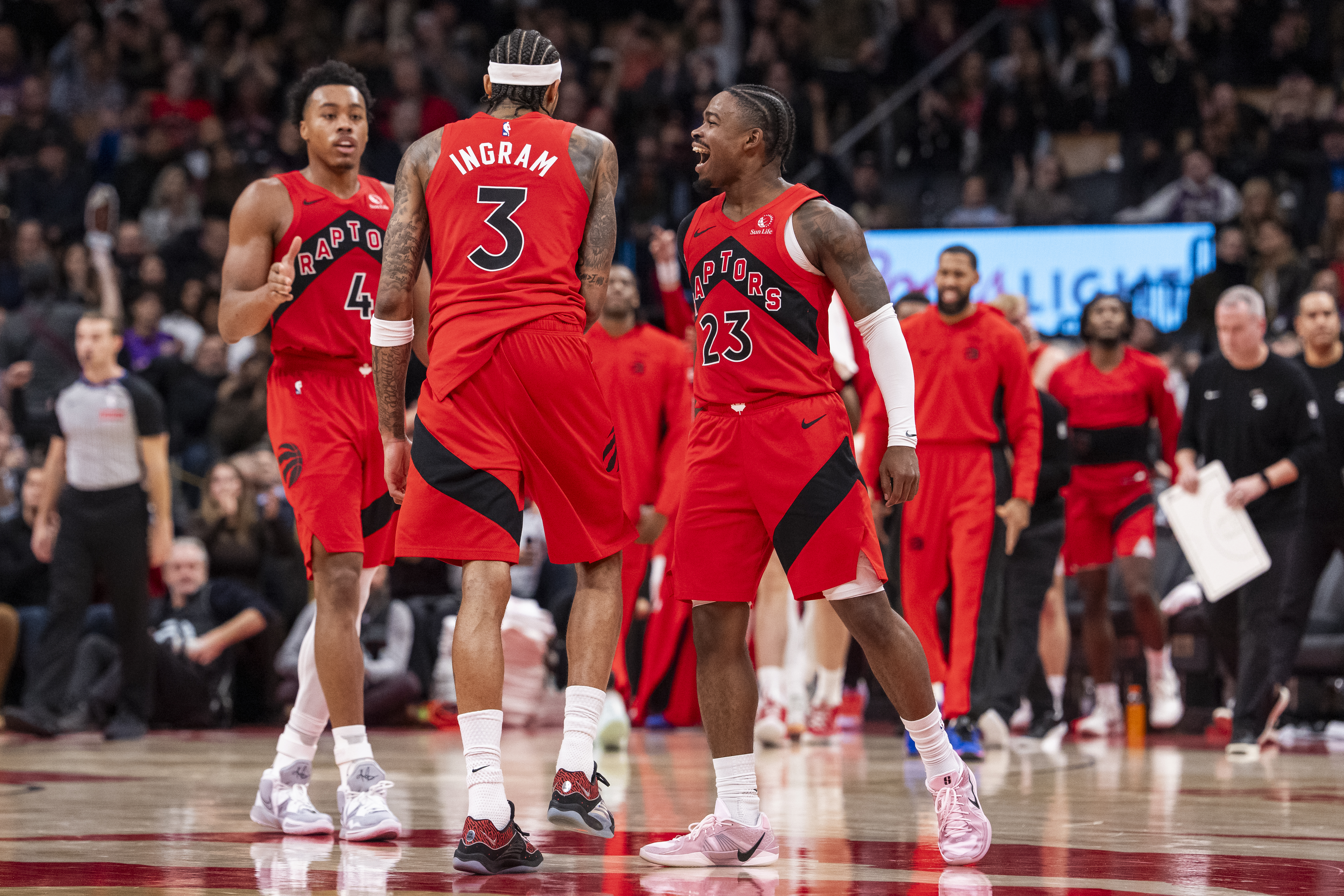 Getty TORONTO, ON – 24 DE NOVIEMBRE: Brandon Ingram #3 de los Toronto Raptors celebra una canasta de tres puntos contra los Cleveland Cavaliers con sus compañeros Scottie Barnes #4 y Jamal Shead #23 durante la acción de la segunda mitad en el Scotiabank Arena el 24 de noviembre de 2025 en Toronto, Ontario, Canadá. (Foto por Andrew Lahodynskyj/Getty Images)