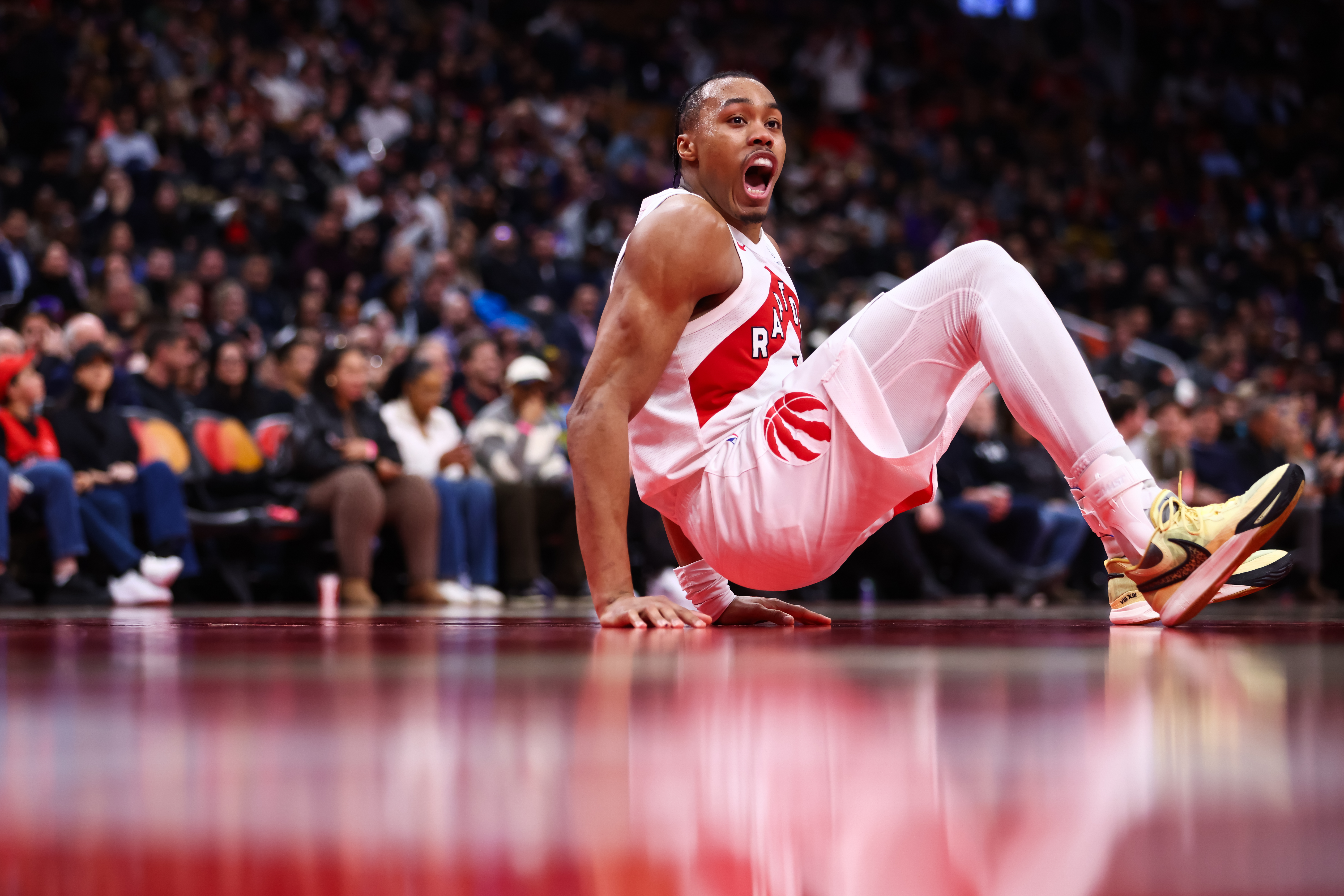 Getty TORONTO, CANADÁ – 11 DE FEBRERO: Scottie Barnes #4 de los Toronto Raptors reacciona en el suelo durante la segunda mitad de su partido de la NBA contra los Detroit Pistons en el Scotiabank Arena el 11 de febrero de 2026 en Toronto, Ontario, Canadá. (Foto de Cole Burston/Getty Images)
