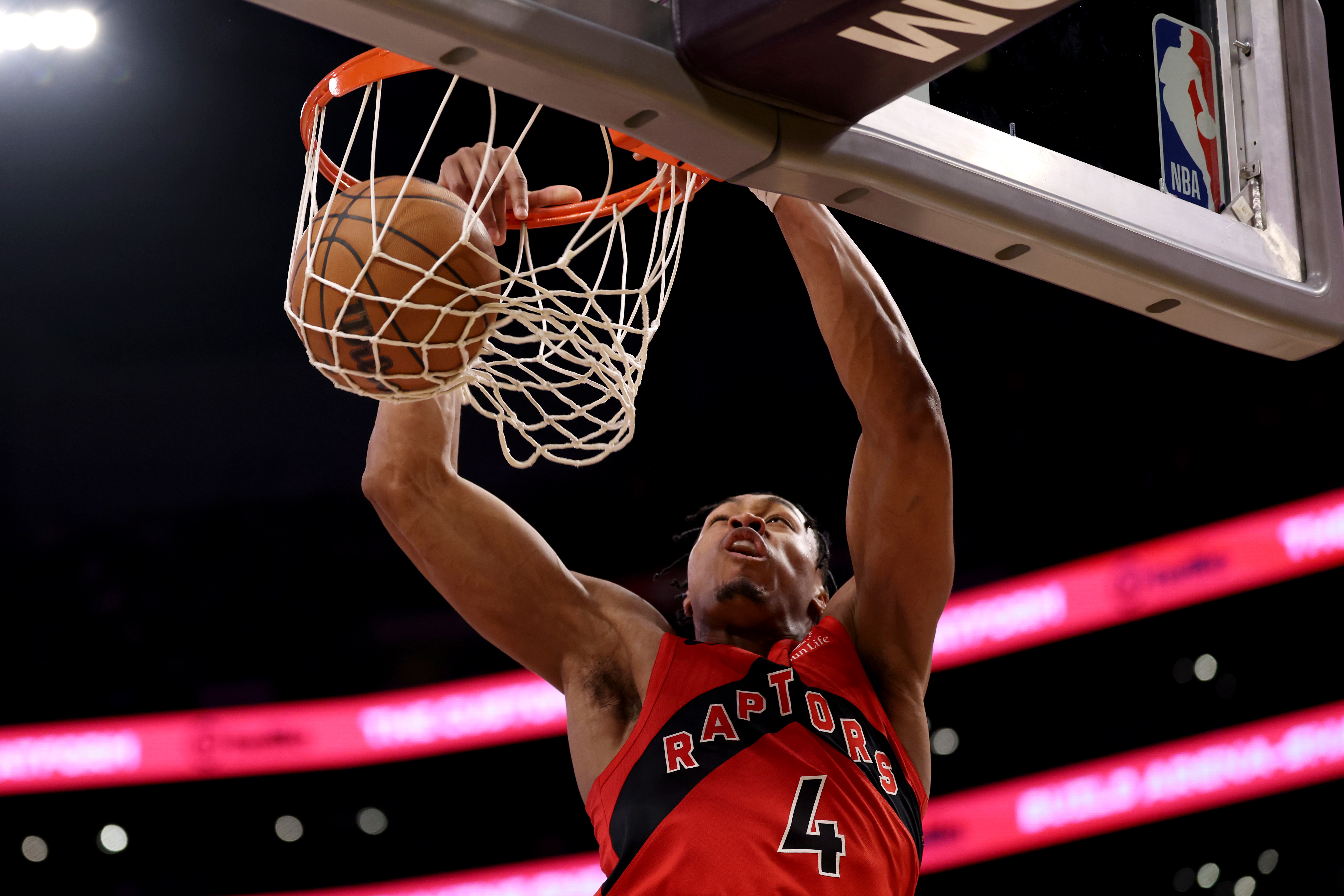 Getty LOS ÁNGELES, CALIFORNIA – 18 DE ENERO: Scottie Barnes #4 de los Toronto Raptors realiza una clavada durante el cuarto cuarto contra Los Angeles Lakers en el Crypto.com Arena el 18 de enero de 2026 en Los Ángeles, California. (Foto de Katelyn Mulcahy/Getty Images)