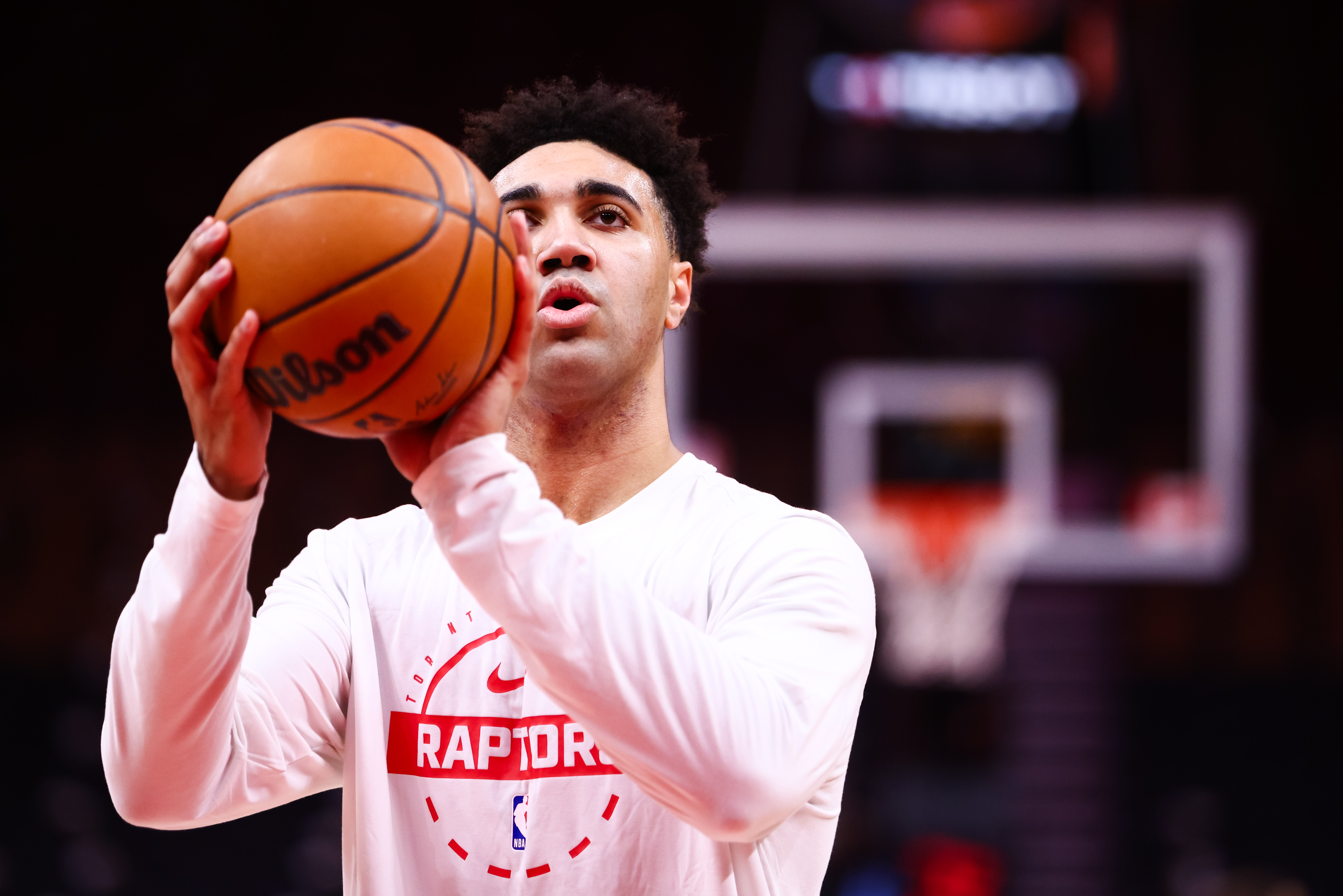 Getty TORONTO, CANADÁ – 8 DE FEBRERO: Trayce Jackson-Davis #32 de los Toronto Raptors calienta antes de su partido de la NBA contra los Indiana Pacers en el Scotiabank Arena el 8 de febrero de 2026 en Toronto, Canadá. (Foto de Cole Burston/Getty Images)