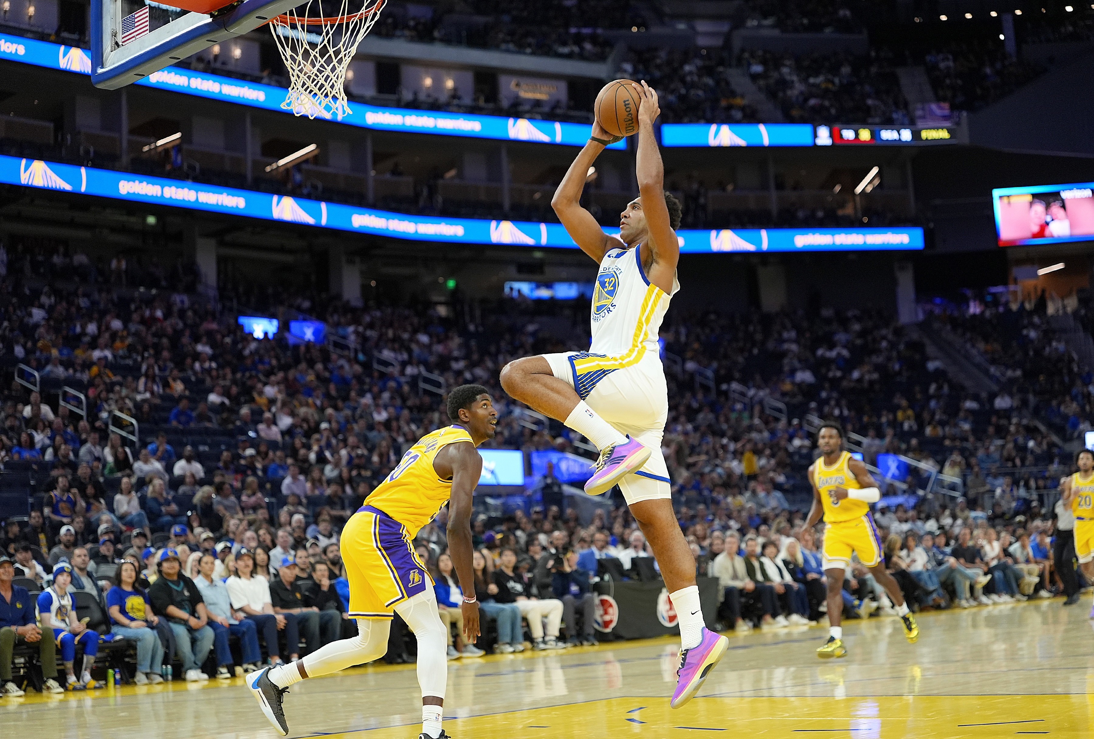 Getty SAN FRANCISCO, CALIFORNIA – 5 DE OCTUBRE: Trayce Jackson-Davis #32 de los Golden State Warriors intenta una volcada contra Los Angeles Lakers en la segunda mitad de un partido de pretemporada de la NBA en el Chase Center el 5 de octubre de 2025 en San Francisco, California. (Foto de Thearon W. Henderson/Getty Images)