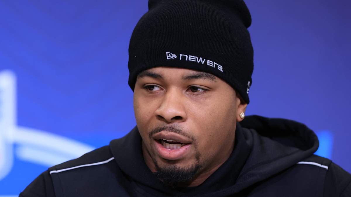 Getty Josiah Trotter de los Missouri Tigers habla con los medios durante el NFL Scouting Combine de 2026.